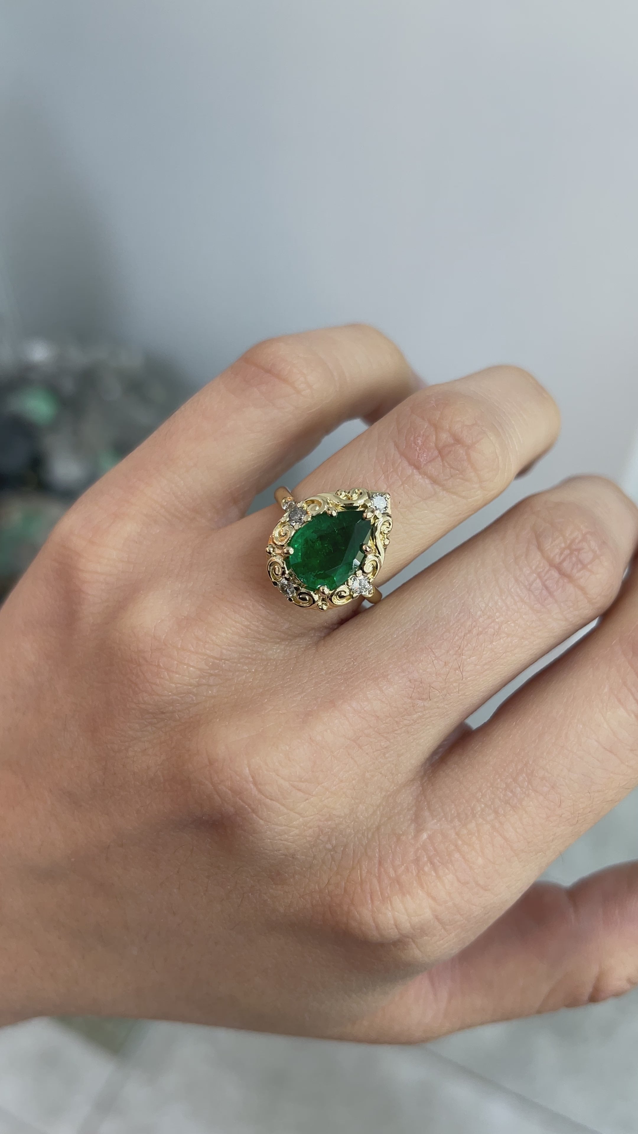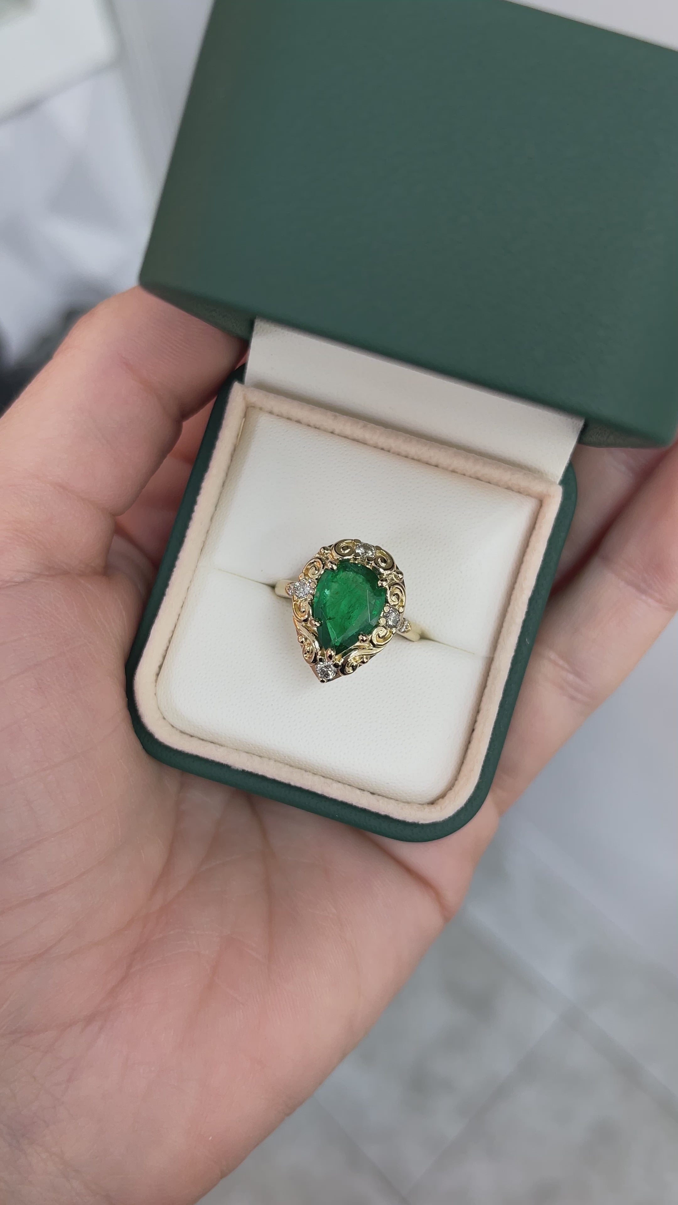 2.66tcw Teardrop Emerald & Diamond Spinkle Scroll Work Vintage Inspired Ring 14K