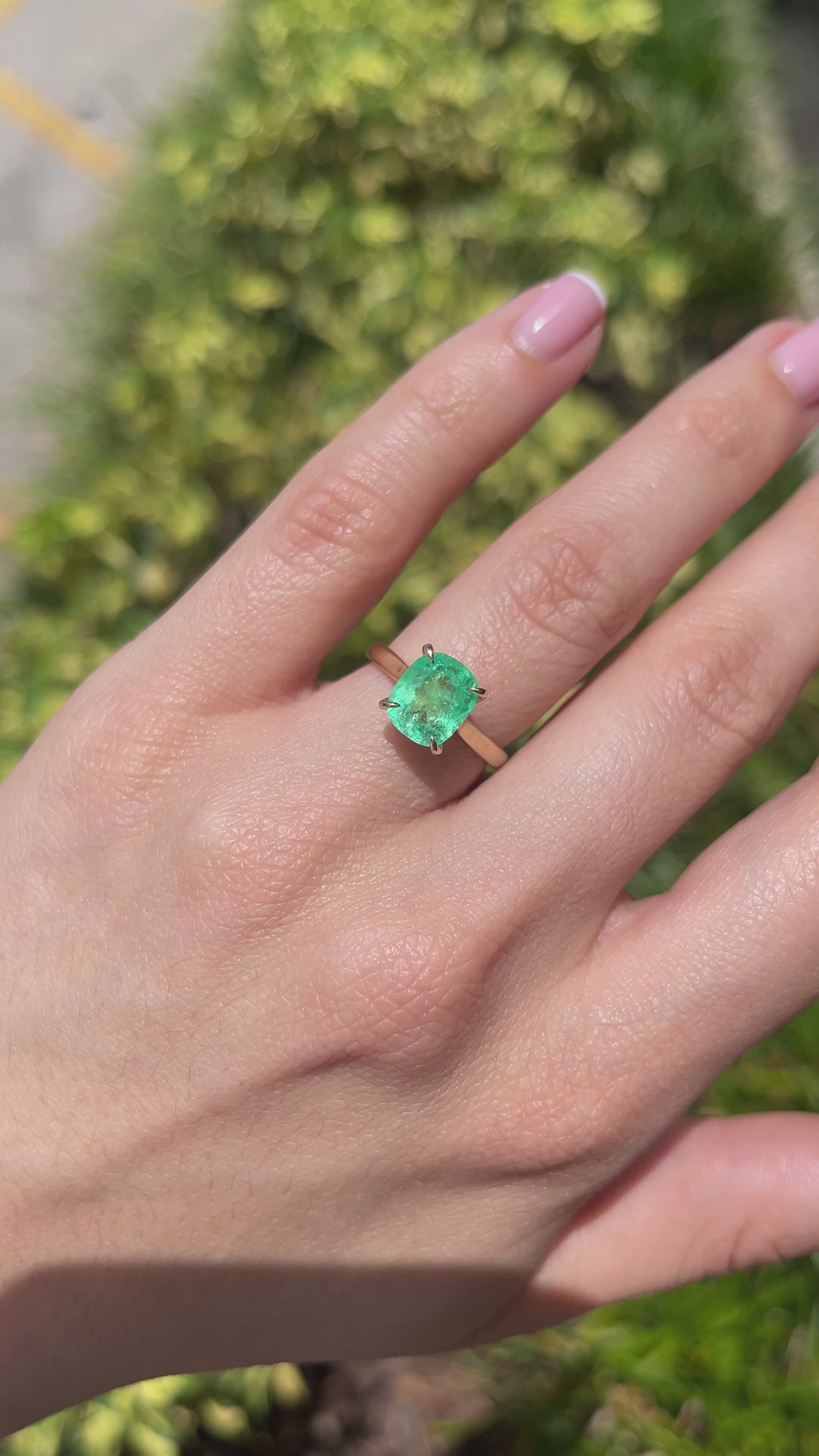 2.75ct 14K Electric Green Cushion Cut Colombian Emerald Cathedral Setting Solitaire Ring