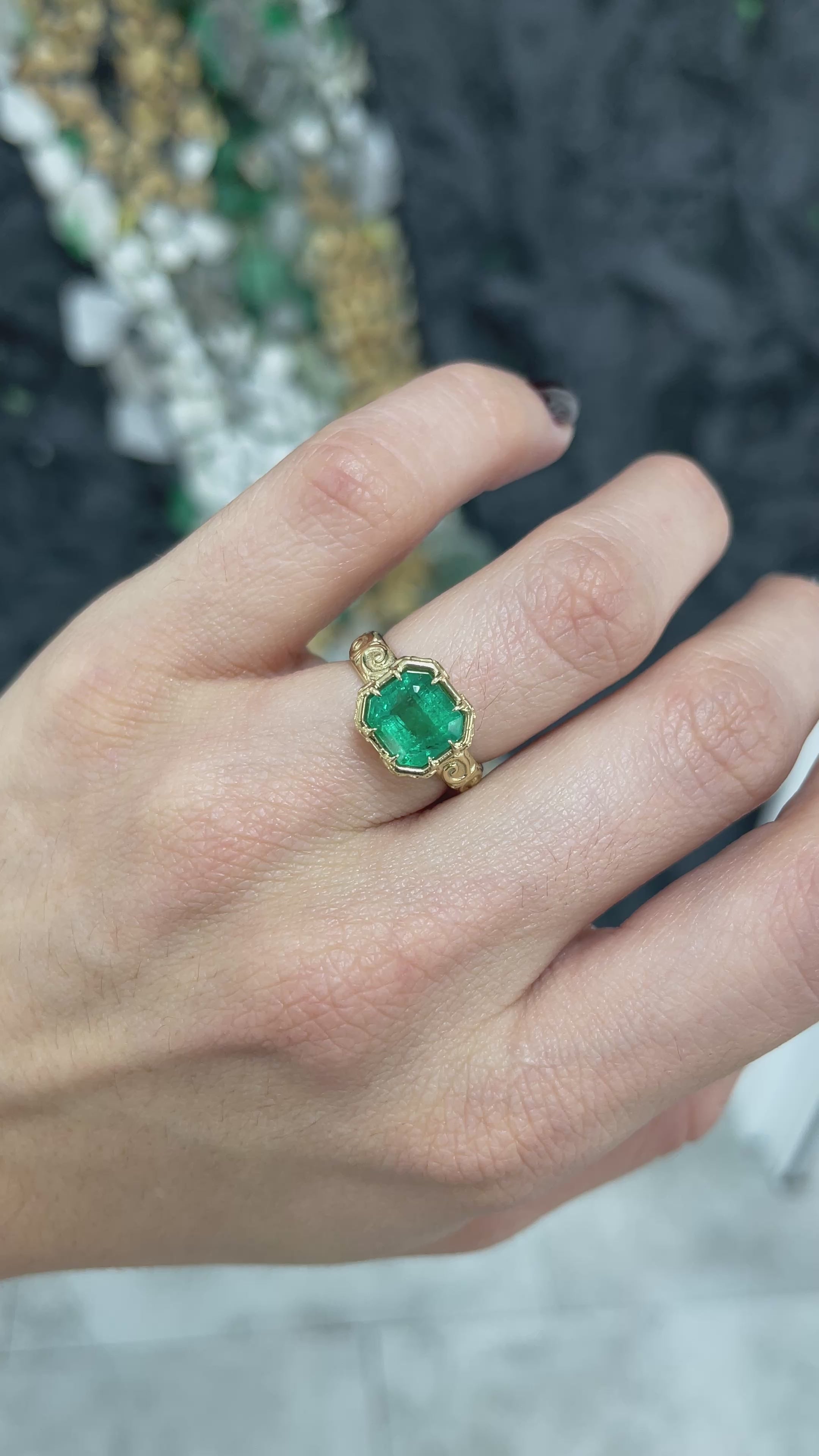 This breathtaking ladies' emerald ring is a true statement of elegance, showcasing a freckled 2.85-carat Zambian emerald with a medium green saturation that mesmerizes with its depth. Exhibiting transparent clarity and beautiful luster, the gemstone radiates brilliance from within. Nestled in a secure multi-prong setting, the emerald is framed by intricate scroll and etch detailing along the shank and bezel, creating an air of regal sophistication. Masterfully crafted in opulent 14k yellow gold, this piece is truly fit for royalty.