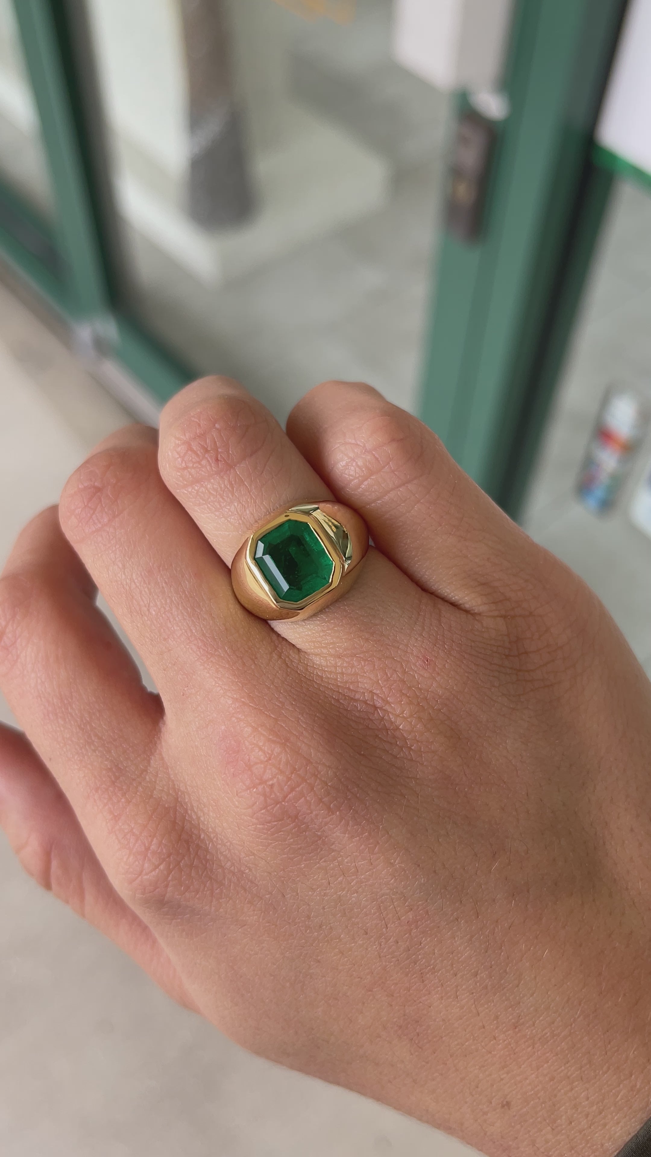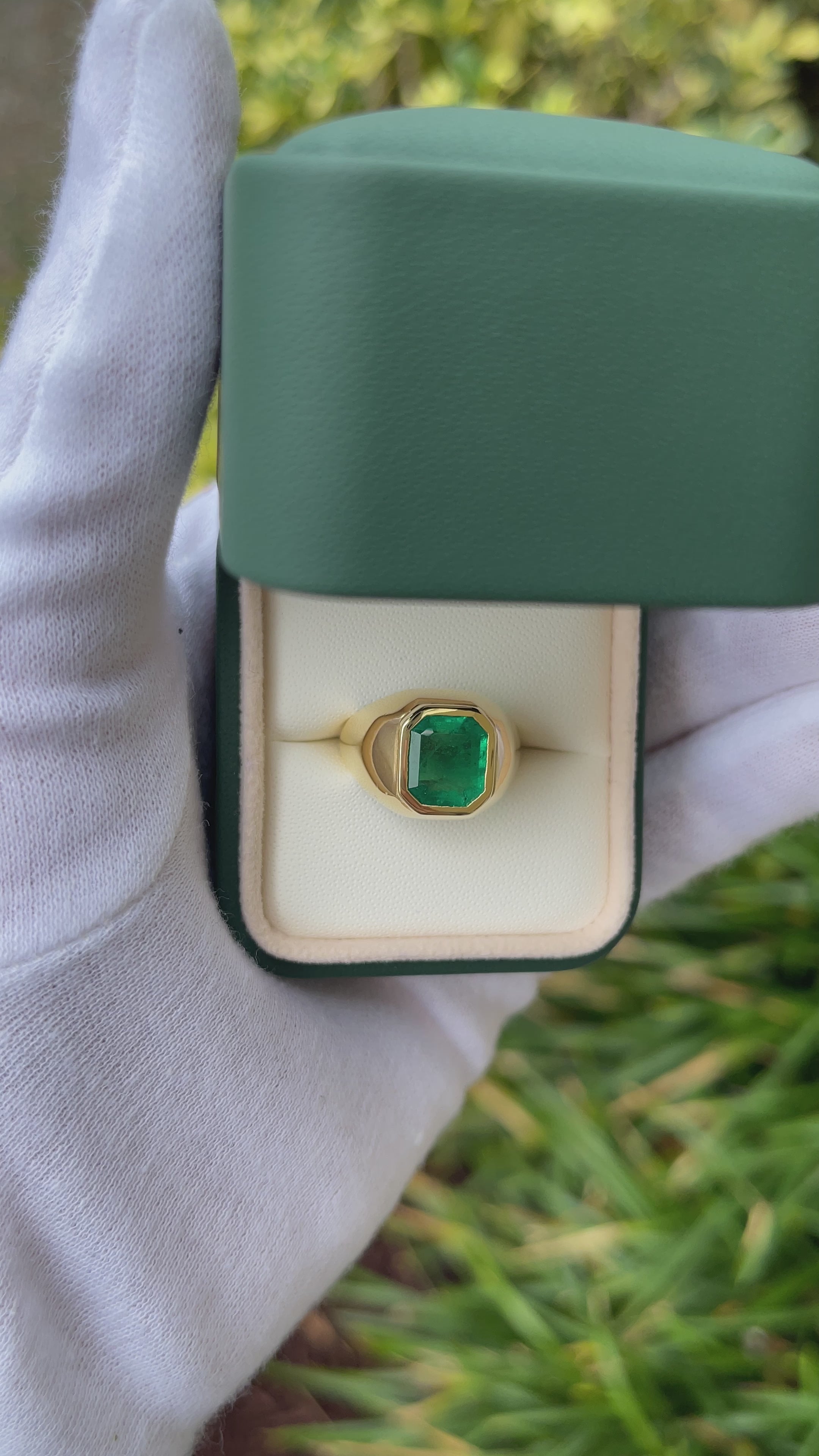 2.90ct 18K Men's Chunky Vivid Dark Green Colombian Emerald Cut Unisex Solitaire Gold Ring