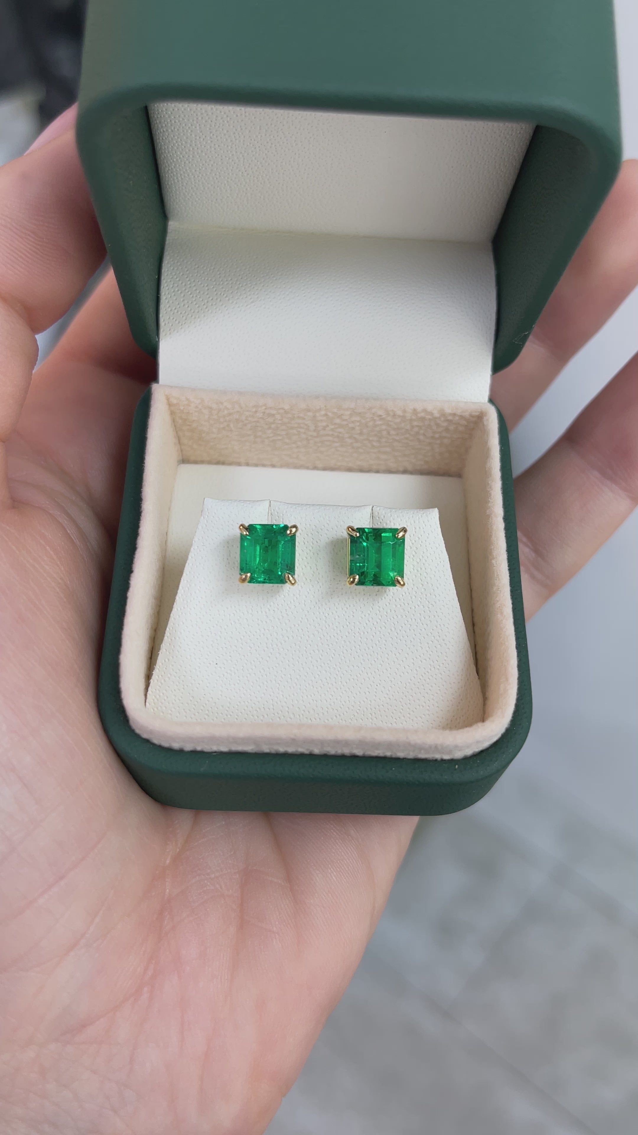 These earrings are not for the faint of heart! Featured here is a stunning set of Asscher cut Colombian emerald studs in fine 18K yellow gold. Displayed are super lustrous, AAA+ vivid green Muzo emeralds with incredible transparency, accented by a simple four-prong 18K yellow gold mount, allowing for the emerald to be shown in full view. The earth-mined, green Colombian emeralds have a desirable lush green color with excellent qualities. These earrings are ideal for everyday use and are the perfect accessory to any outfit.