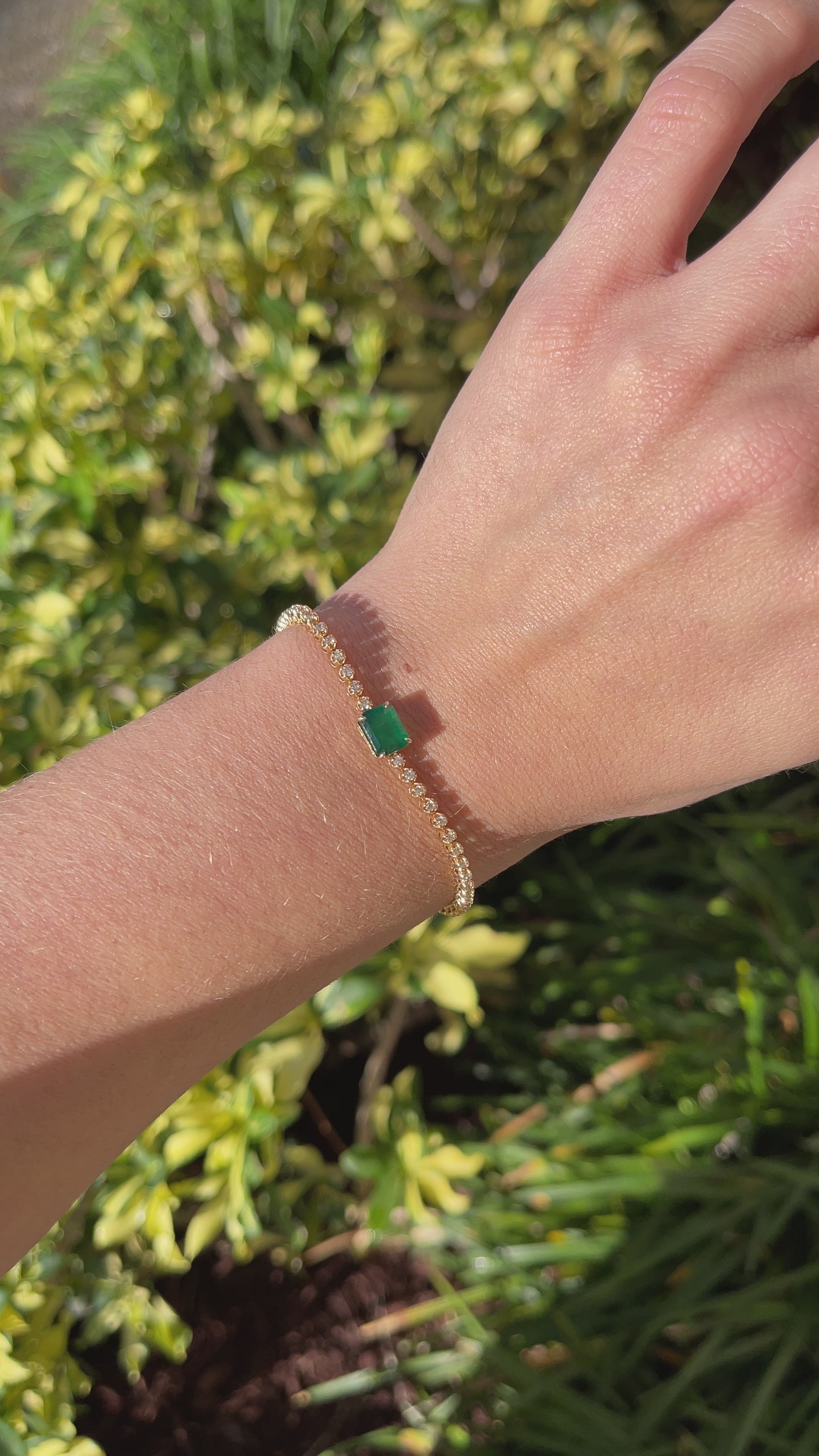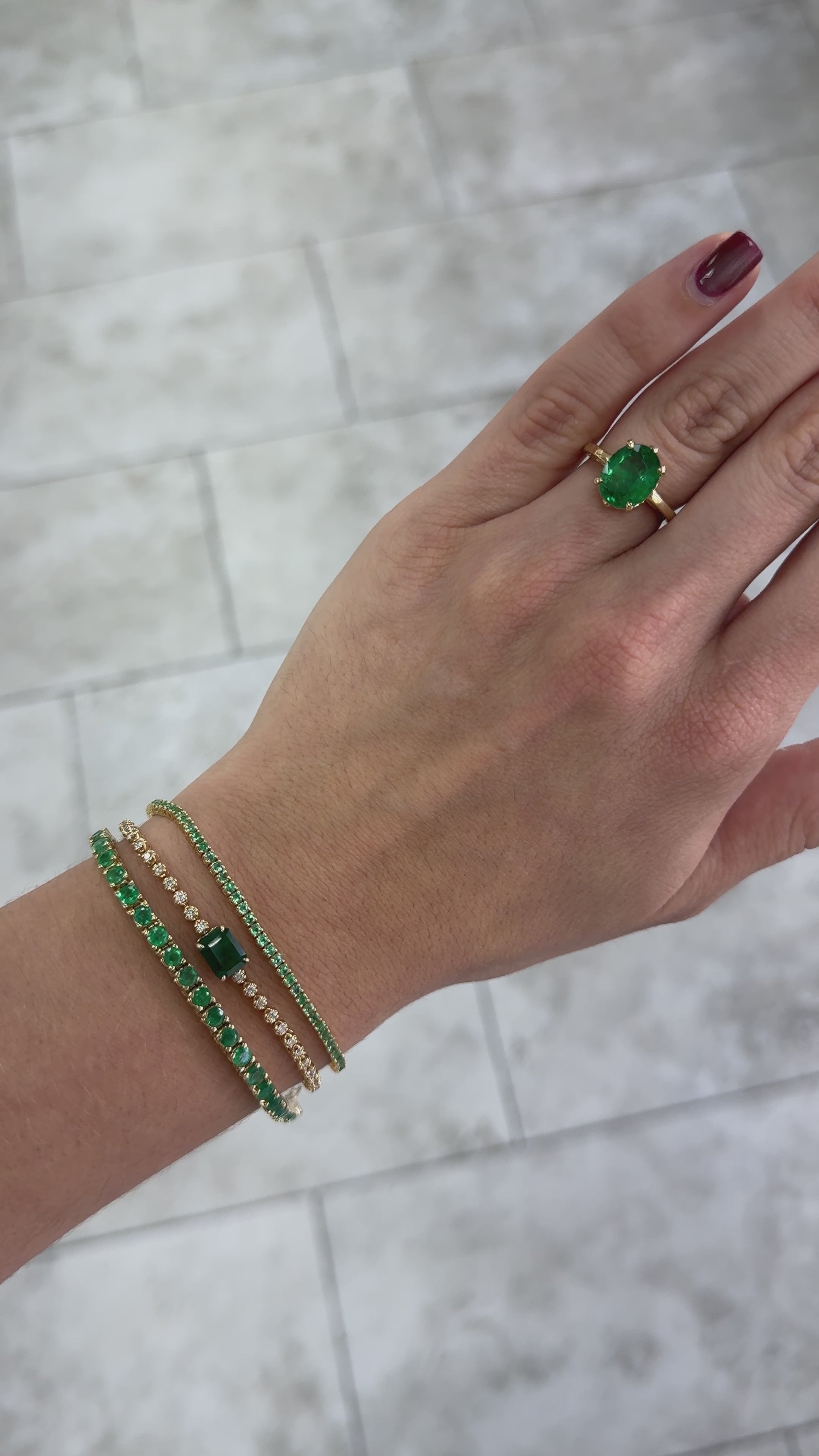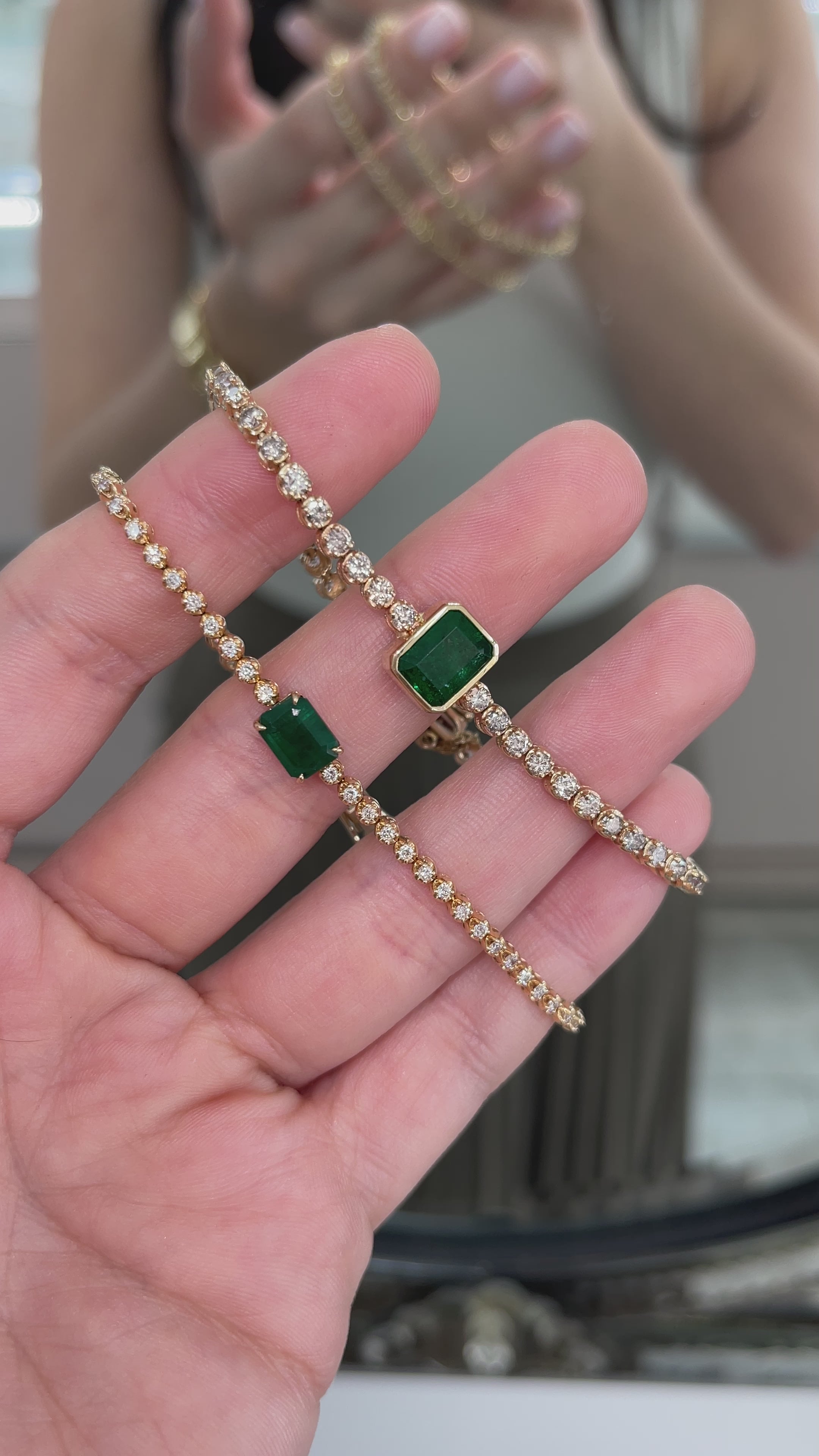 This 3.18 TCW emerald and diamond tennis bracelet in 14K gold is a masterpiece of grace and fire. A bold emerald-cut center stone glows in a lush dark green hue, its depth enhanced by the sparkle of prong-set round diamonds that cascade along golden links. Every movement reveals a harmony of brilliance and color, a fluid story of beauty that feels alive on the wrist. Crafted for the collector of rare treasures, this bracelet is a celebration of elegance that never fades.