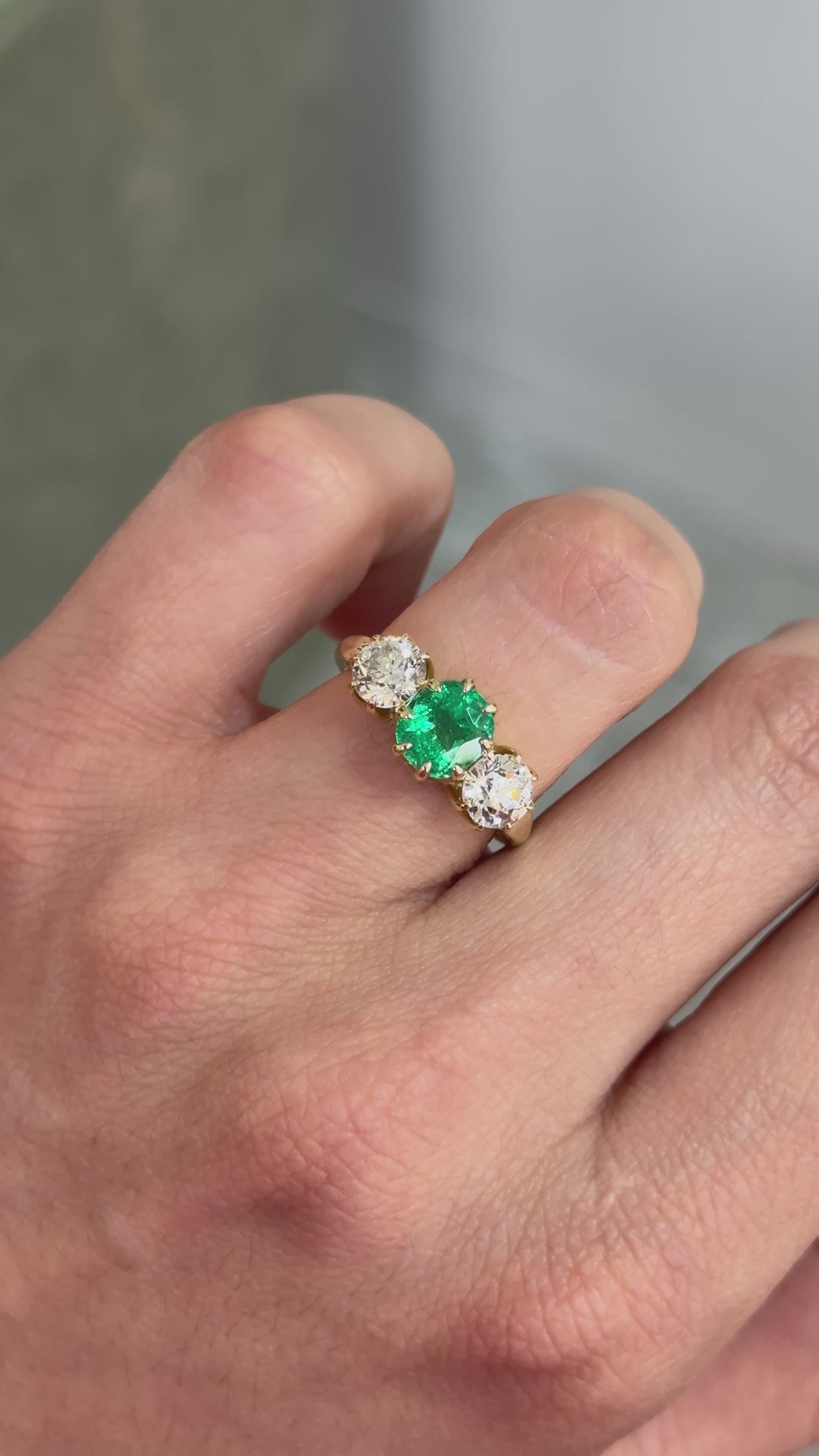 This exquisite three stone ring is a celebration of old world romance and timeless craftsmanship. At its center rests a 1.54 carat Colombian cushion cut emerald, glowing with a vivid bluish green hue, exceptional transparency, and natural brilliance. Its softly rounded facets reflect light with a gentle, antique charm rarely seen in modern cuts.