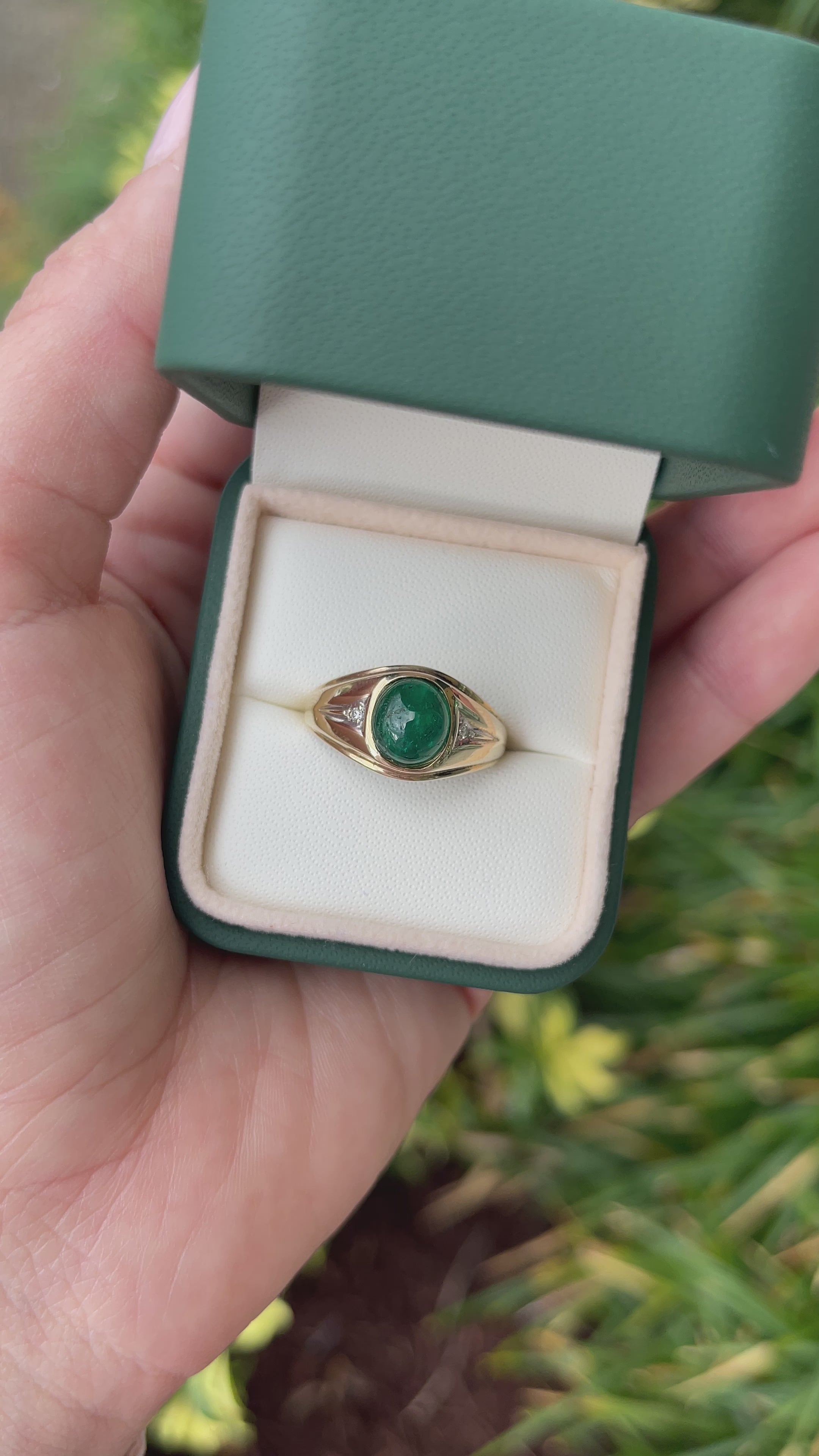 A beautiful three-stone, natural emerald cabochon, and diamond ring. The center stone cabochon has a full 3.16-carats, with a dark green color and very good luster. Accenting the cabochon are two petite brilliant round diamonds. This one-of-a-kind ring is in 10K yellow gold, with a satin finish going halfway down the band giving it the perfect touch.