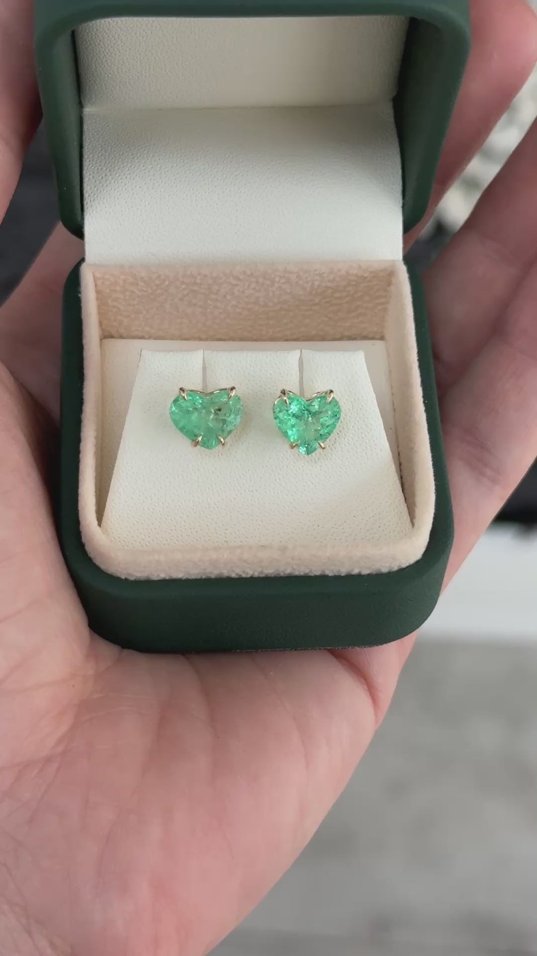 3.24tcw Matching Pair Green Natural Colombian Emerald Hearts Stud Earrings 14K
