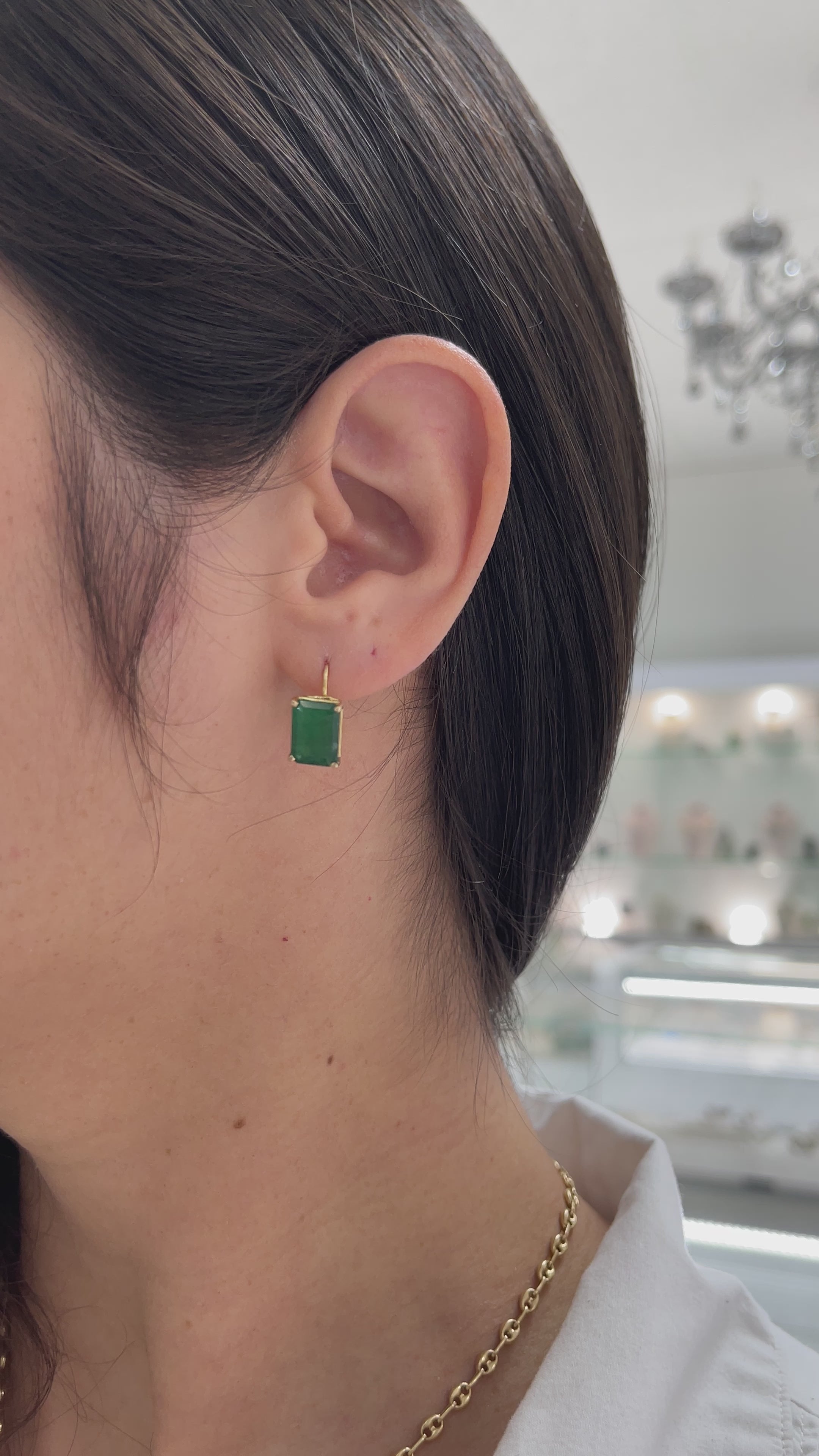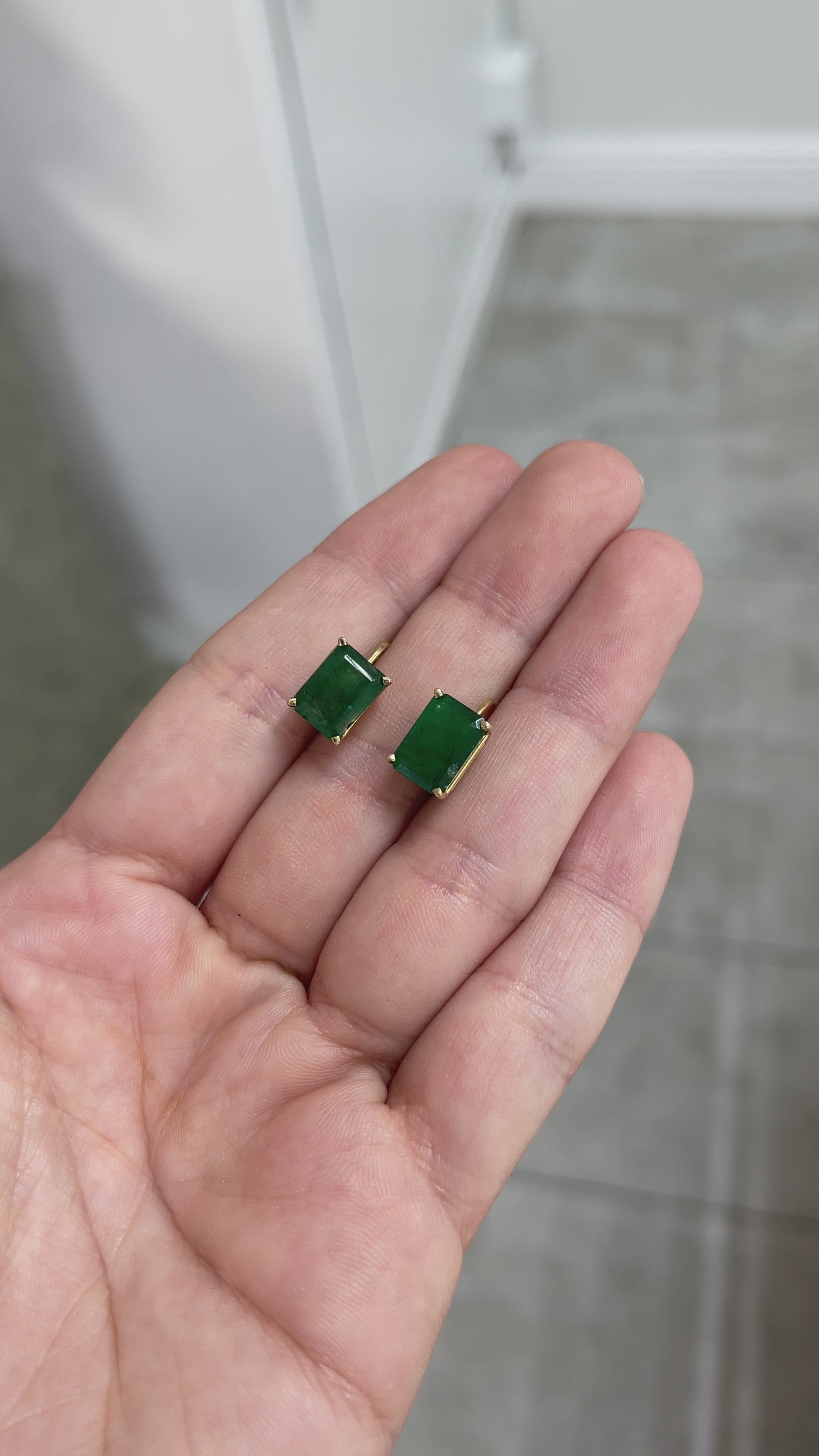 A gorgeous pair of emerald cut-emerald lever back earrings, hand-made in 14K yellow gold. The chic pair of lever-back earrings feature green, natural emeralds. The emeralds have beautiful eye clarity with minor imperfections! The forest green emeralds display minor flaws that are normal in all earth-mined gems. The solitaire prong setting shows the beautiful color that the gems have to offer. Ideal earrings for everyday wear!