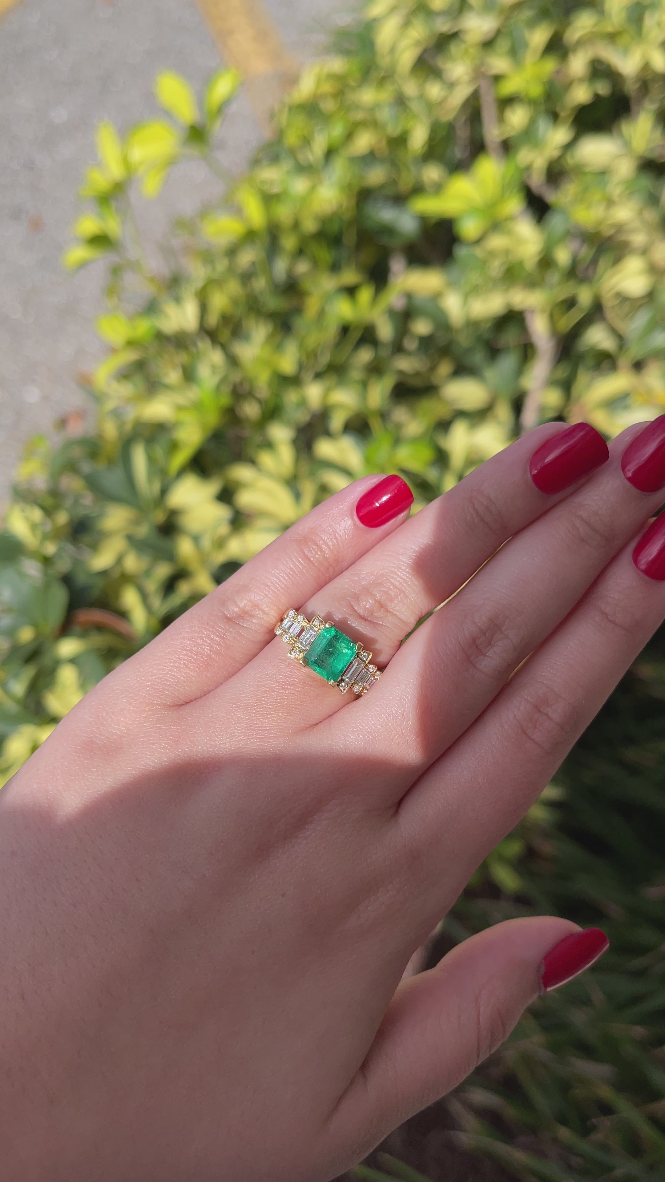 Indulge in timeless elegance with our Emerald & Diamond Accent Ring featuring a captivating emerald-cut emerald set north to south, boasting a rich green hue and exquisite characteristics that command attention. Set in a refined four-prong setting, the emerald is adorned with baguette-cut and round-cut diamonds along the shank, enhancing its allure with brilliant sparkle. Expertly crafted in luxurious 18k yellow gold, this ring is a radiant symbol of sophistication and style.