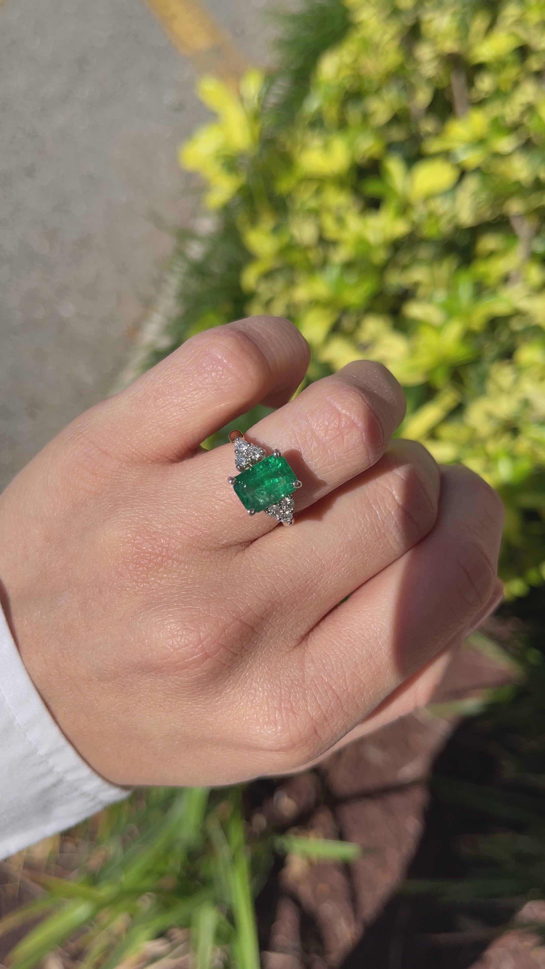 Discover the perfect emerald engagement ring with this breathtaking 3.34-carat natural emerald cut emerald ring, designed for those who appreciate timeless elegance and rare gemstones. The center stone is a genuine emerald, showcasing a deep green hue with captivating clarity. As a natural, earth-mined gem, it features characteristic inclusions and surface fissures that highlight its authenticity and uniqueness.