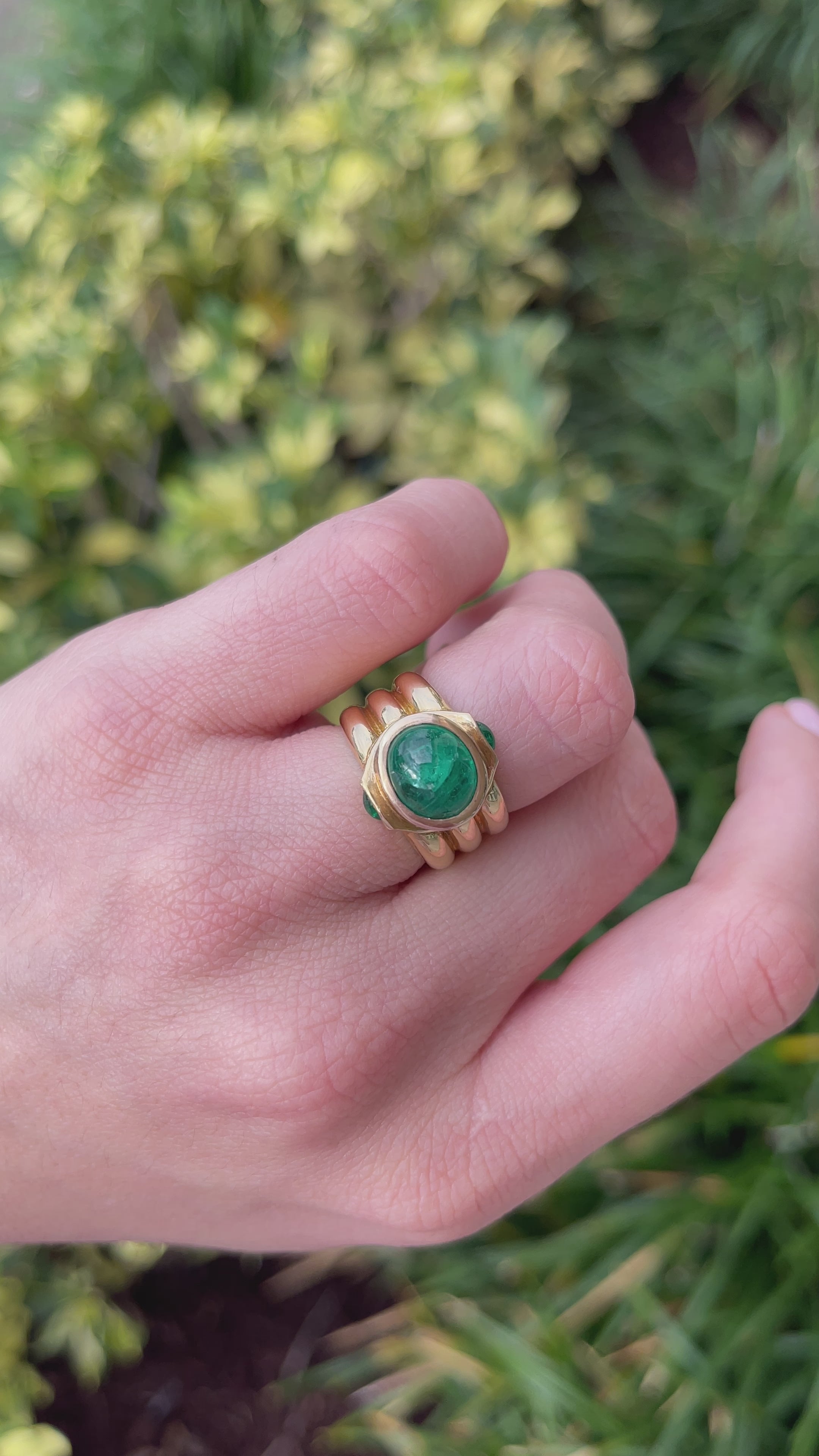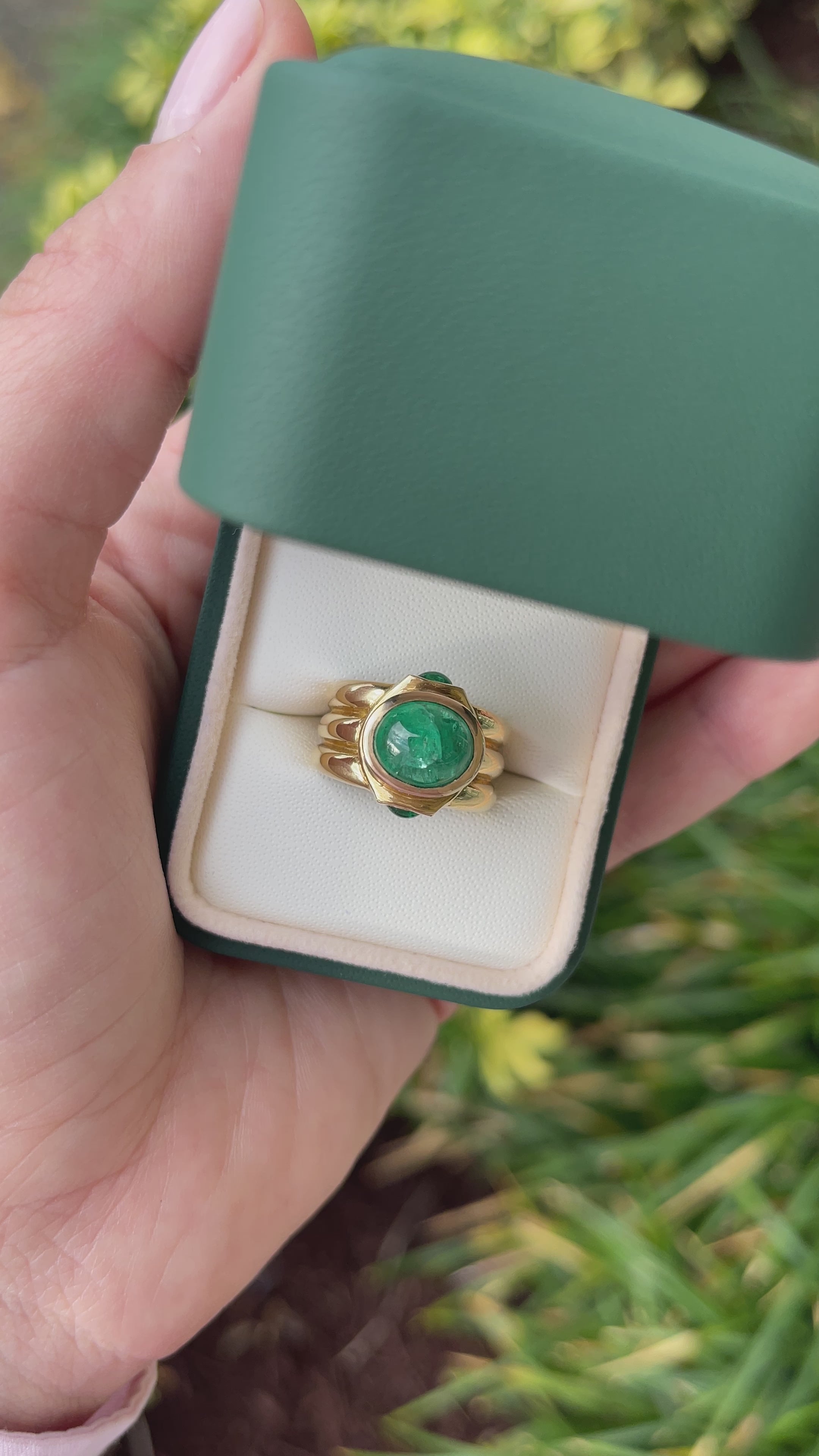 A one of a kind men's natural emerald cabochon ring. Featuring the center stone, with a full 3.42-carat cabochon with a beautiful dark green color. Accented by two smaller cabochons totaling 0.45tcw set north to south. All stones are carefully bezel set within its custom 14k yellow gold setting. The perfect everyday pinky ring.