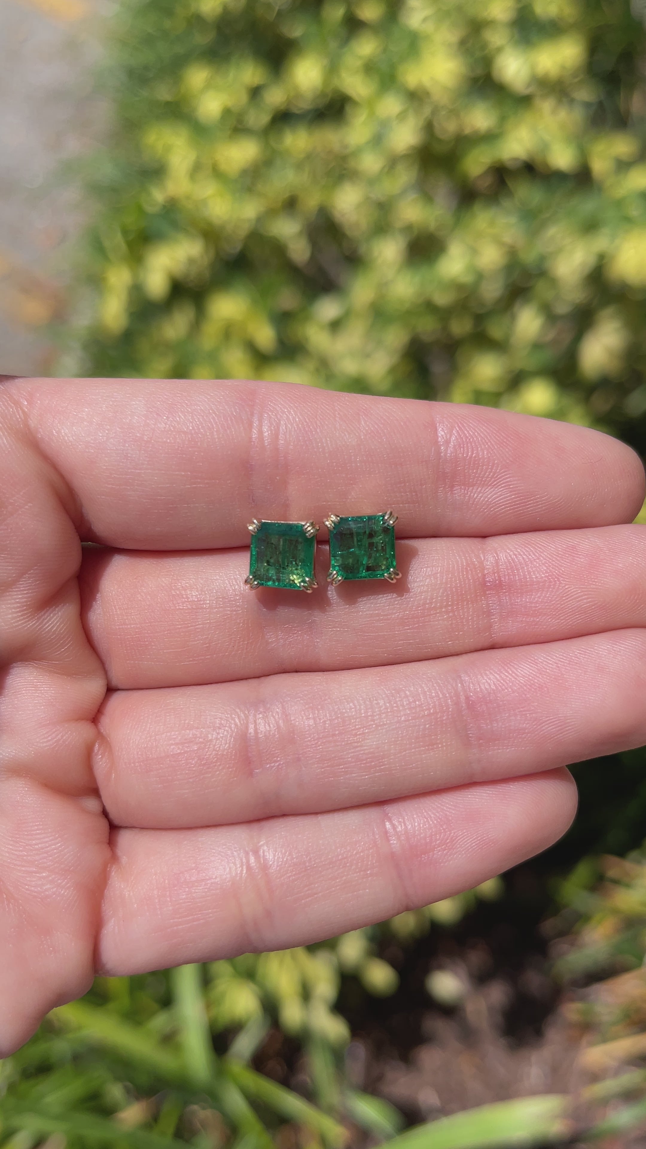 3.98tcw Freckled Asscher Cut Natural Emerald Double Prong Stud Earrings 14K
