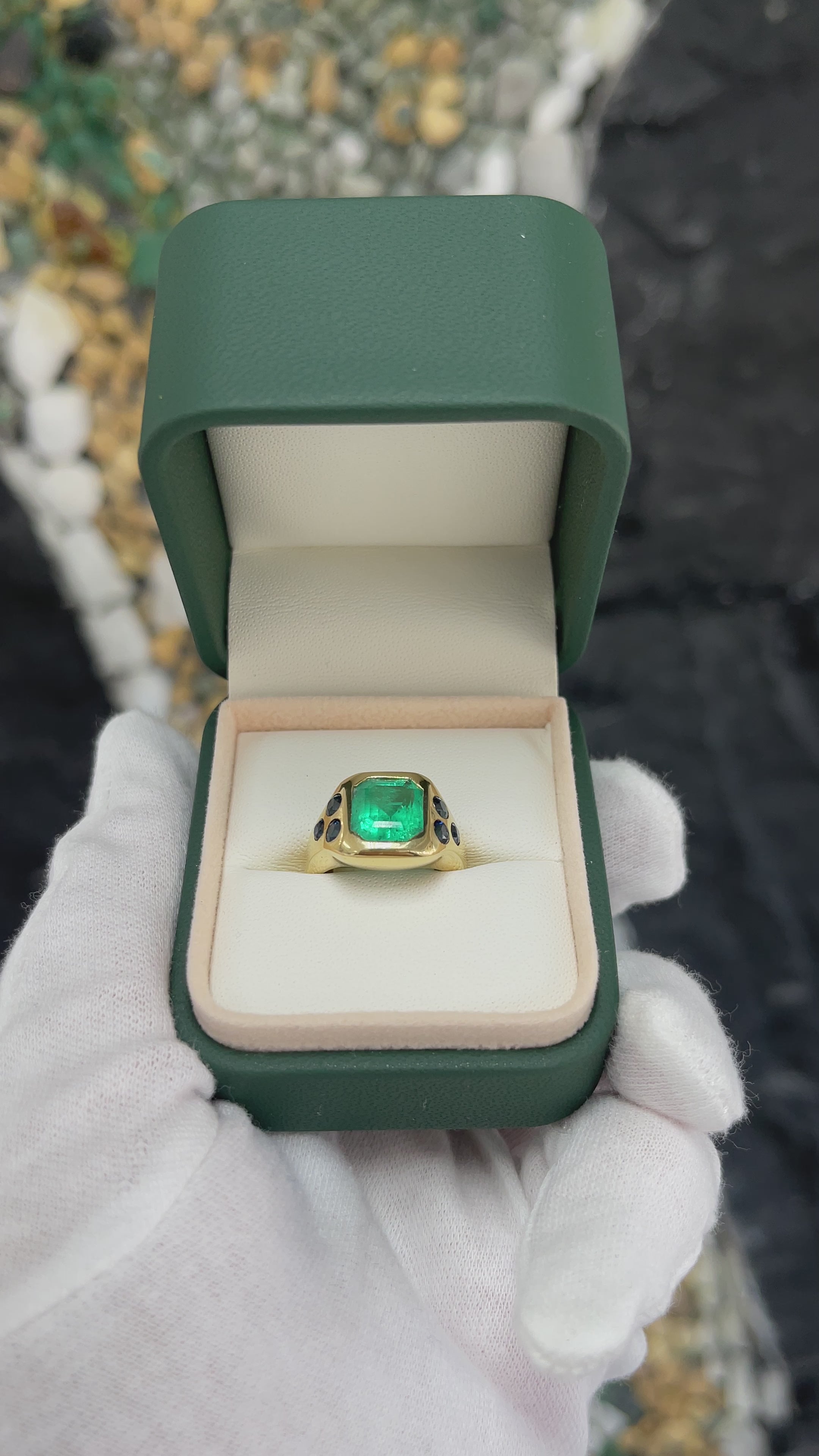4.20tcw 18K Green Emerald & Blue Round Sapphire Gypsy Signet Gold Ring