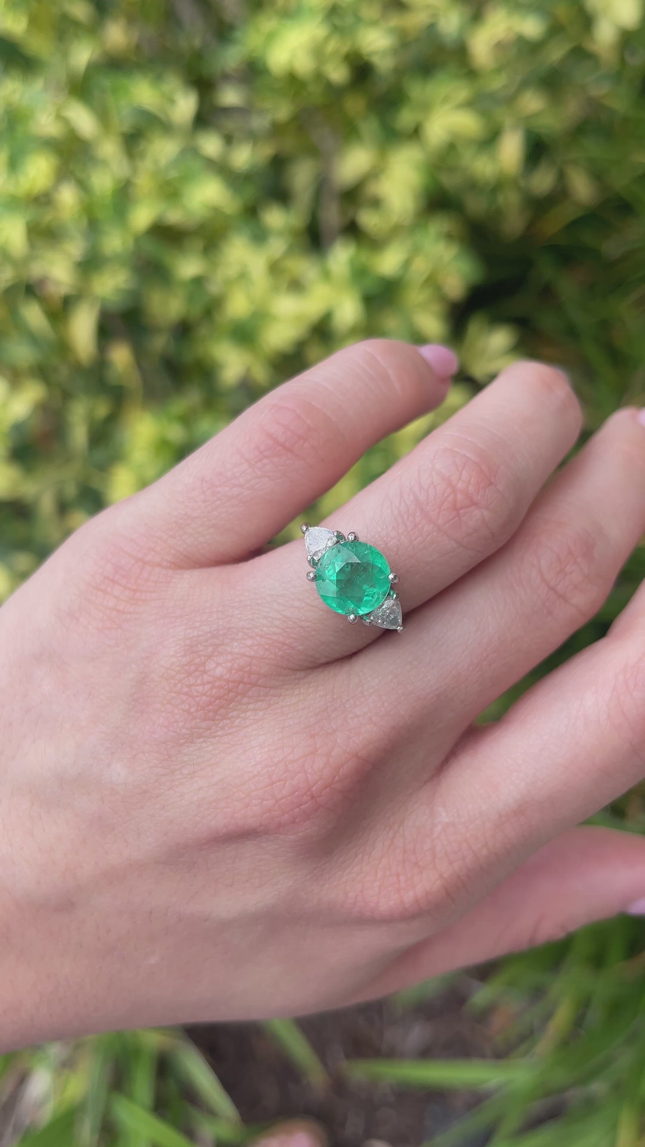 Rare and radiant, this 4.39tcw round Colombian emerald glows with vivid green intensity, a gemstone of exceptional presence. Brilliant trillion cut diamonds flank the centerstone, reflecting light with precision and fire. Skillful hand crafted by our master goldsmith in solid 14K white gold, this three-stone ring carries traditional elegance elevated by rare Colombian origin mined from the prominent mines of Muzo. A masterpiece of color, light, and craftsmanship, designed with timeless artistry.