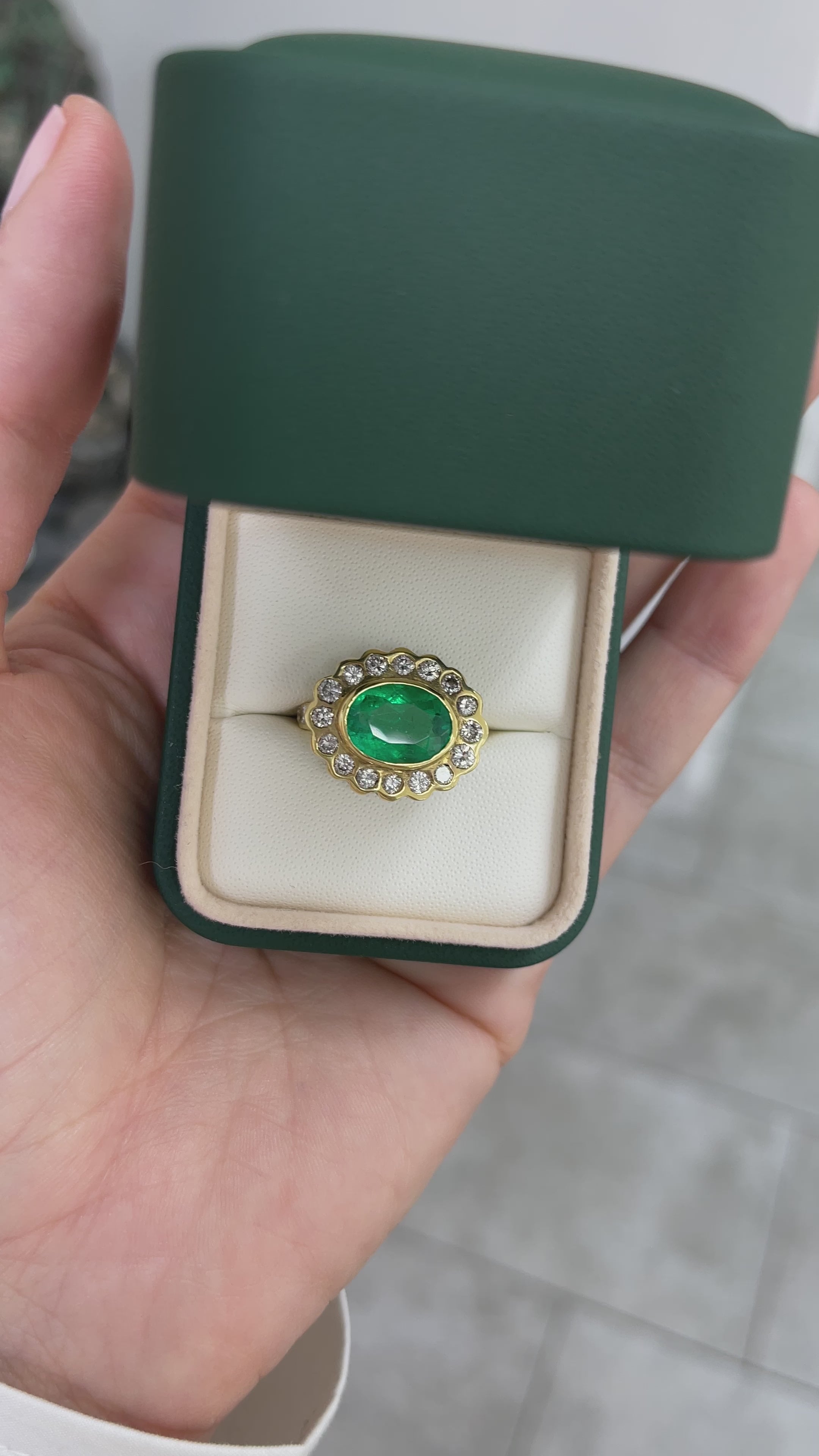 This stunning ring features a Colombian emerald of exceptional quality, cut into an elegant oval shape and set in 18k gold. The rich, dark green color of the emerald is truly vivid and eye-catching. The center stone is surrounded by a sparkling halo of brilliant round cut diamonds that accentuate its beauty and add a touch of glamour. The shank of the ring is also adorned with diamonds that create a stunning floral design halfway around the band. Crafted with exquisite attention to detail and using only the finest materials, this ring is sure to impress and make a statement.