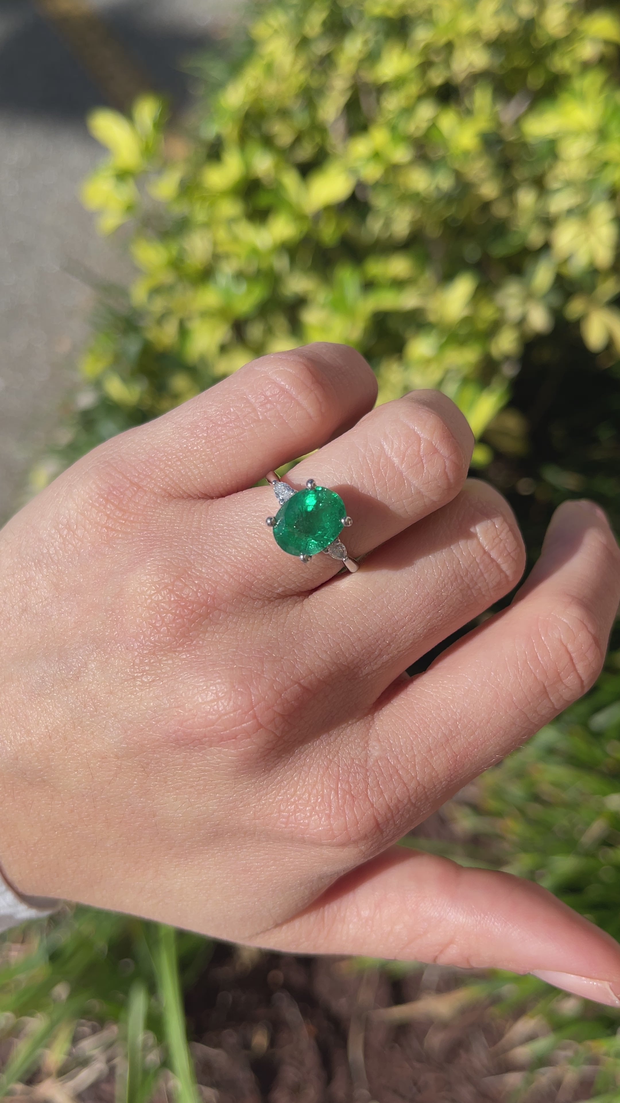4.52tcw Vivid Green Natural Oval Emerald & Pear Diamond Three Stone Platinum Ring