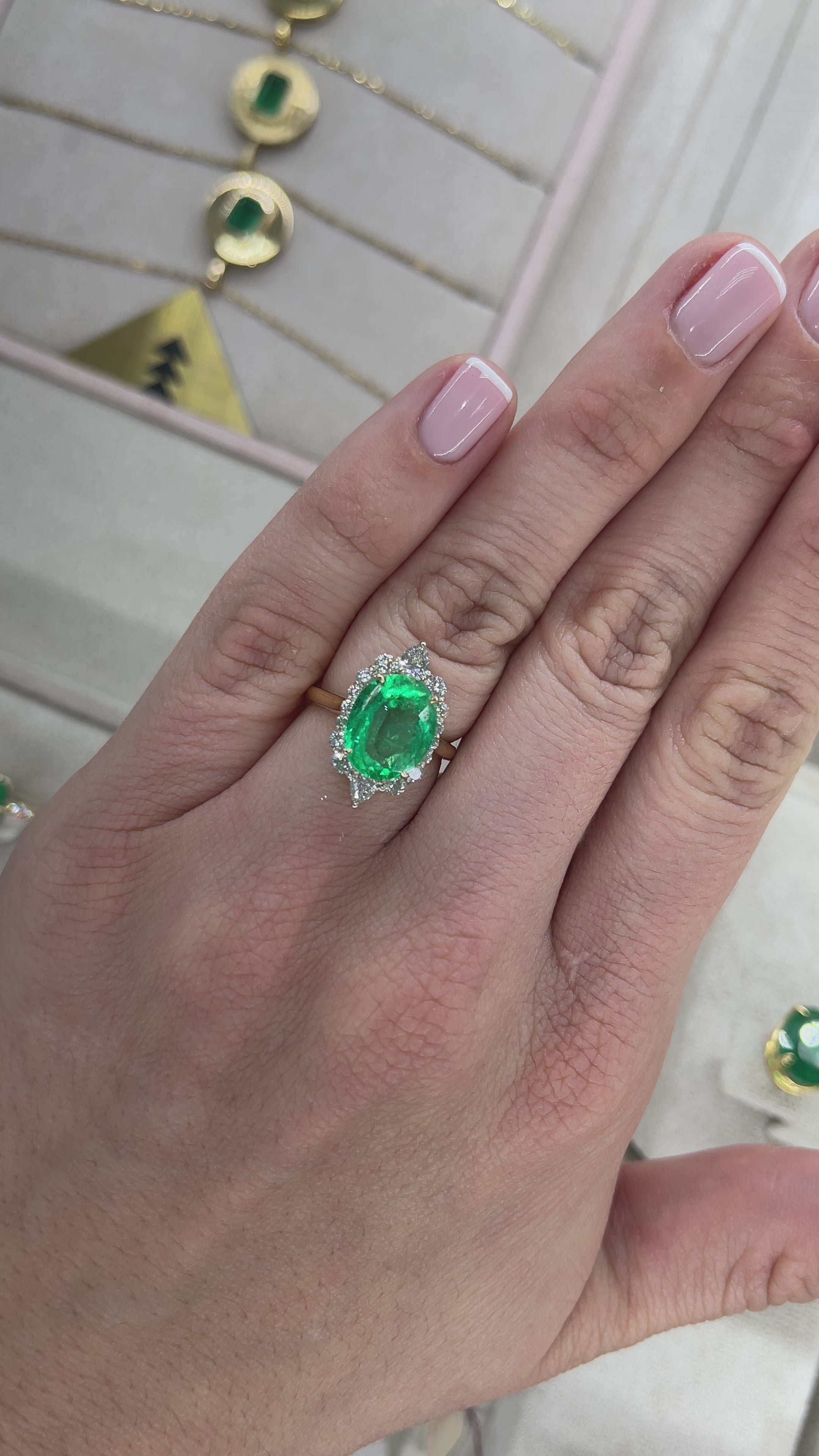 Behold a masterpiece of enchantment: a Muzo green Colombian emerald, nestled within a radiant sea of glistening diamonds. This oval emerald glows with a rare yellowish-green hue, exuding an otherworldly clarity that captures the essence of nature’s perfection. A delicate, internal inclusion—completely contained within the gem—only adds to its story, a quiet whisper of its journey through the earth.