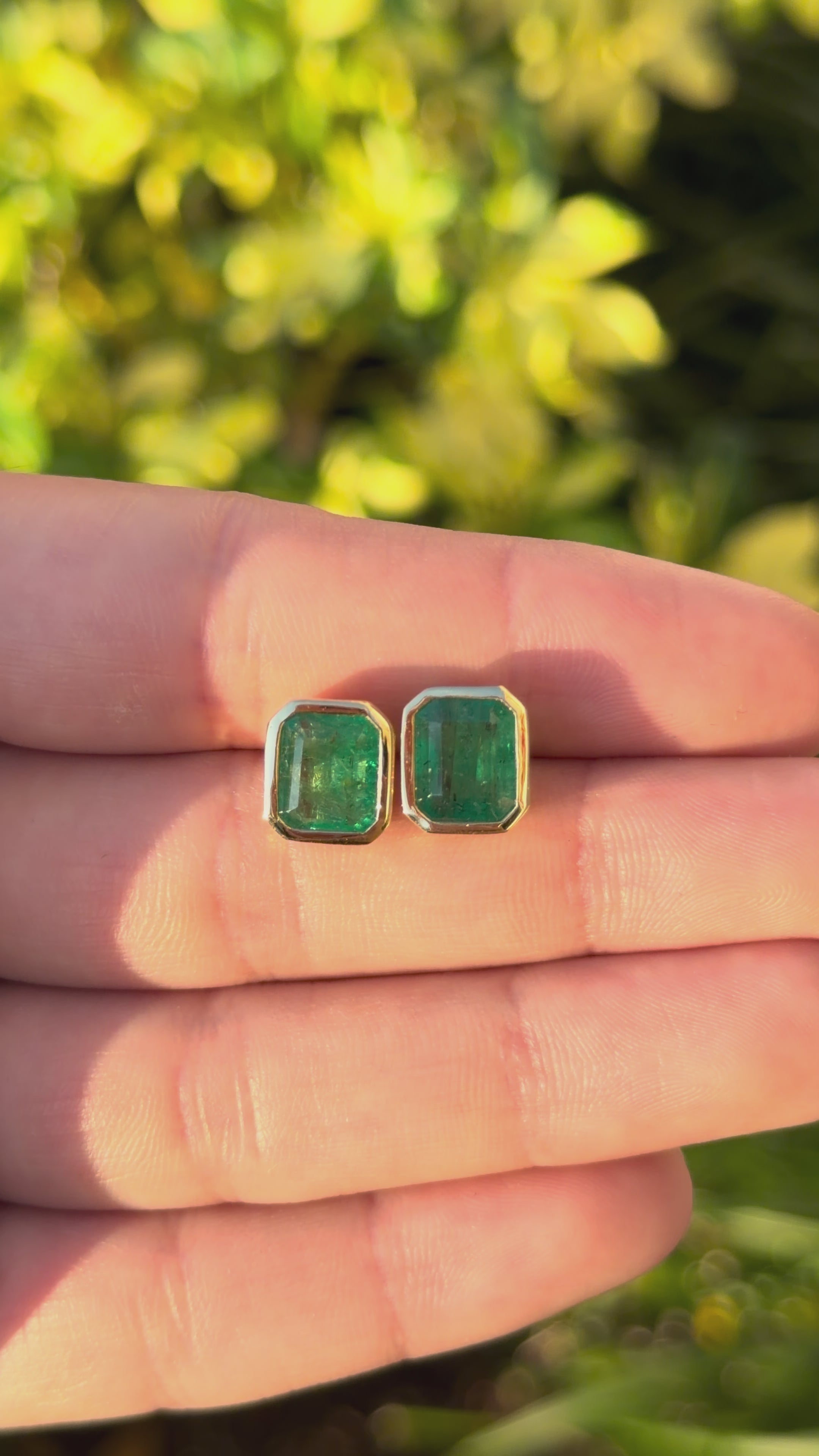 4.56tcw Emerald Cut Emerald Bezel Studs 18K