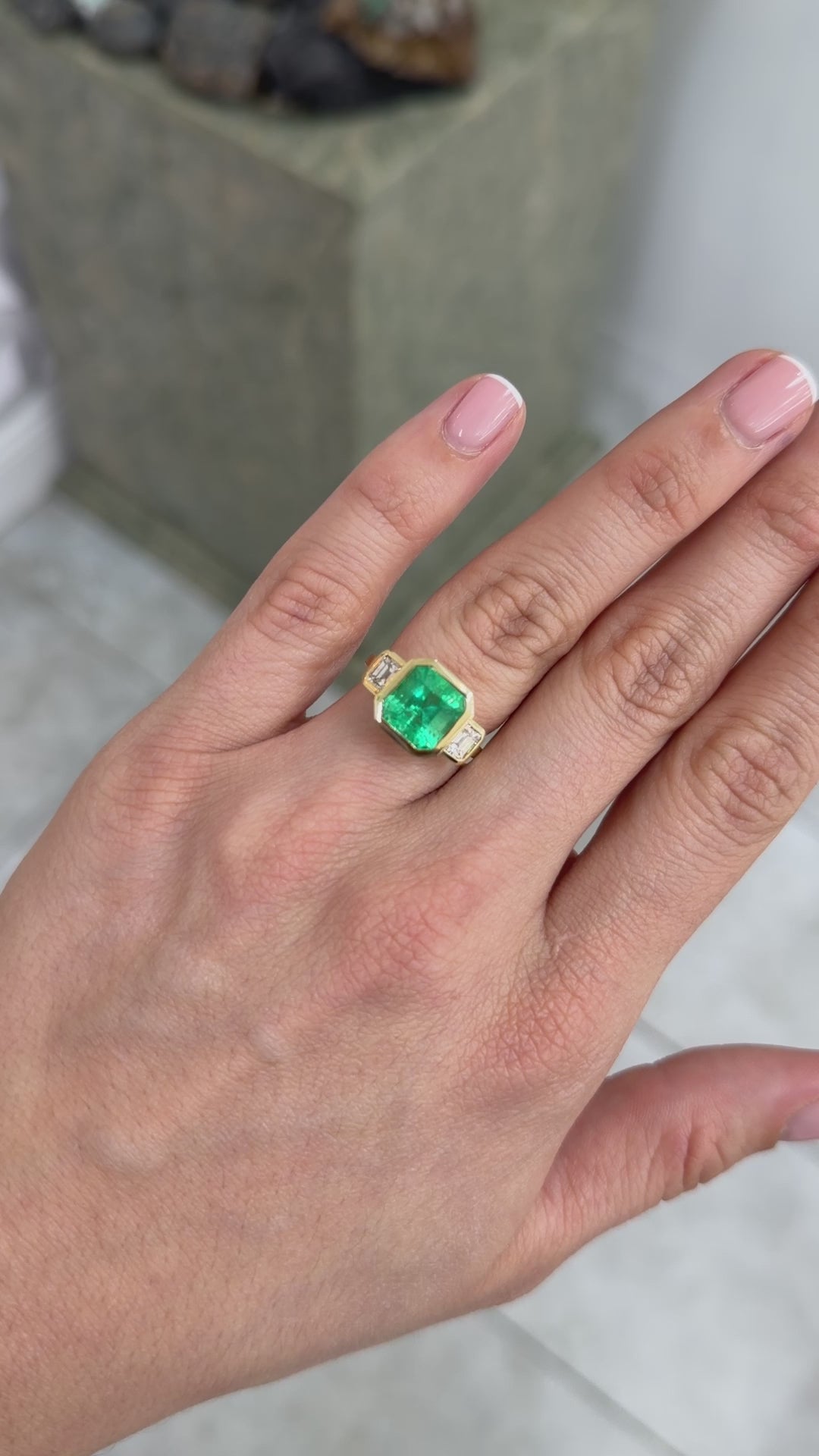 4.68tcw Bezel Set Three Stone Asscher Cut Emerald & Emerald Cut Diamond Ring 14K