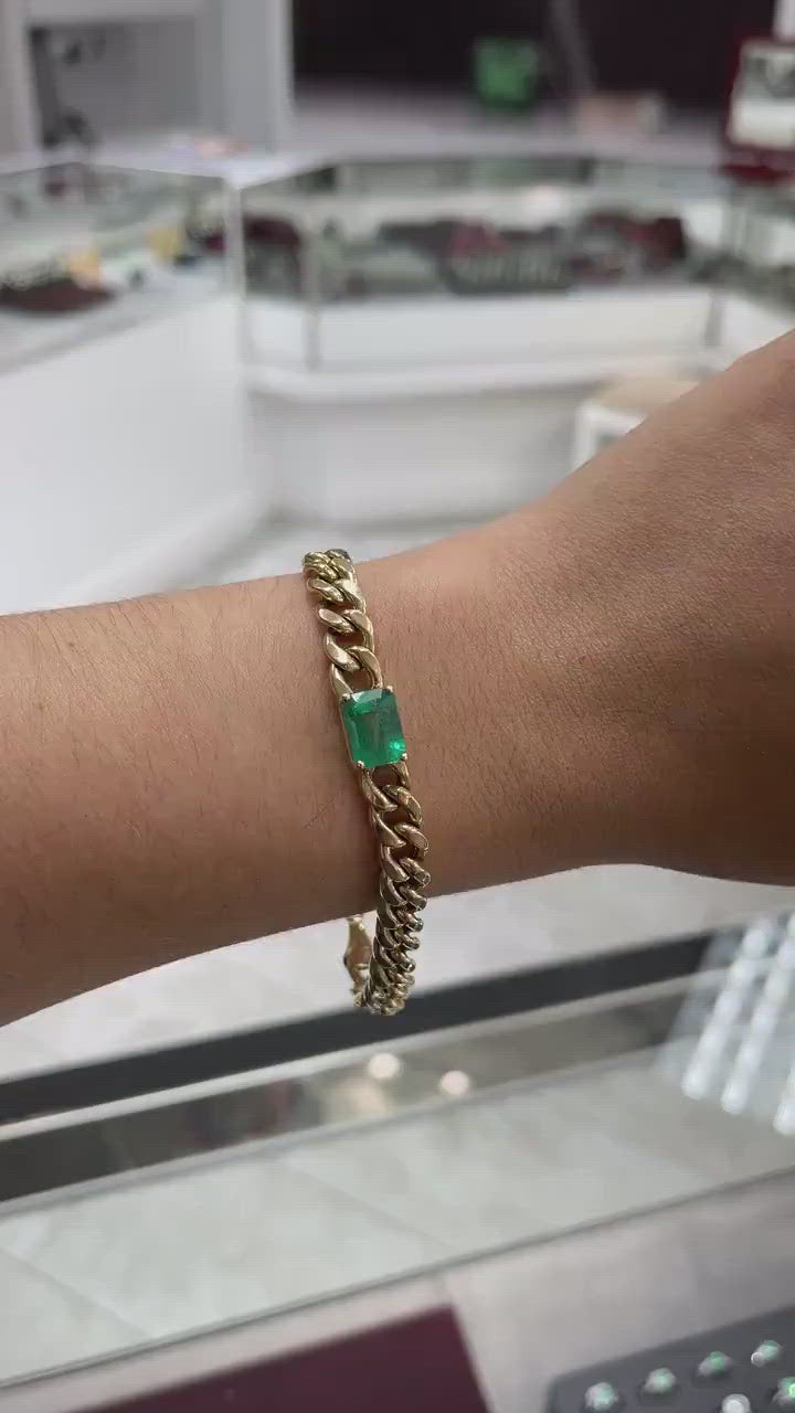 Take a peek at this stunning solitaire, natural emerald bracelet. The featured gemstone is a stunning 4.87-carat, natural Zambian emerald displaying great eye clarity and luster. Set in a 14K yellow gold, four-prong setting attached to a solid Cuban link chain. Bold, and classy; unisex 7.3mm Cuban Bracelet