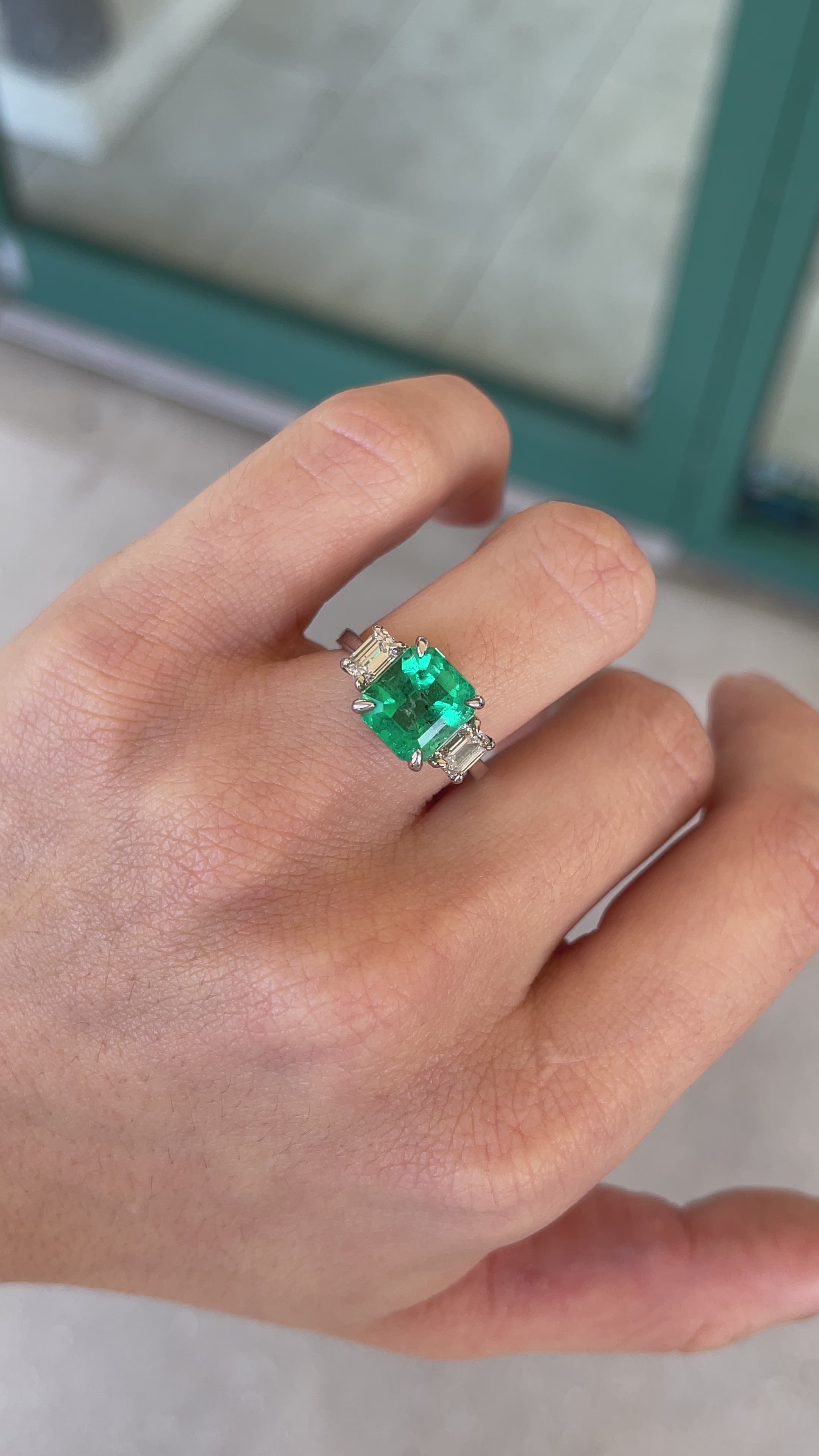 Introducing our exquisite three-stone ring, a breathtaking fusion of elegance and luxury. Crafted in 18k white gold, it showcases a mesmerizing 4.09-carat Colombian emerald, radiating a vivid, rich green hue that captivates with its allure. Flanked by 1.01 carats of emerald-cut diamonds on either side, boasting VVS2 clarity and J color, this masterpiece exudes sophistication and timeless beauty with every glance.