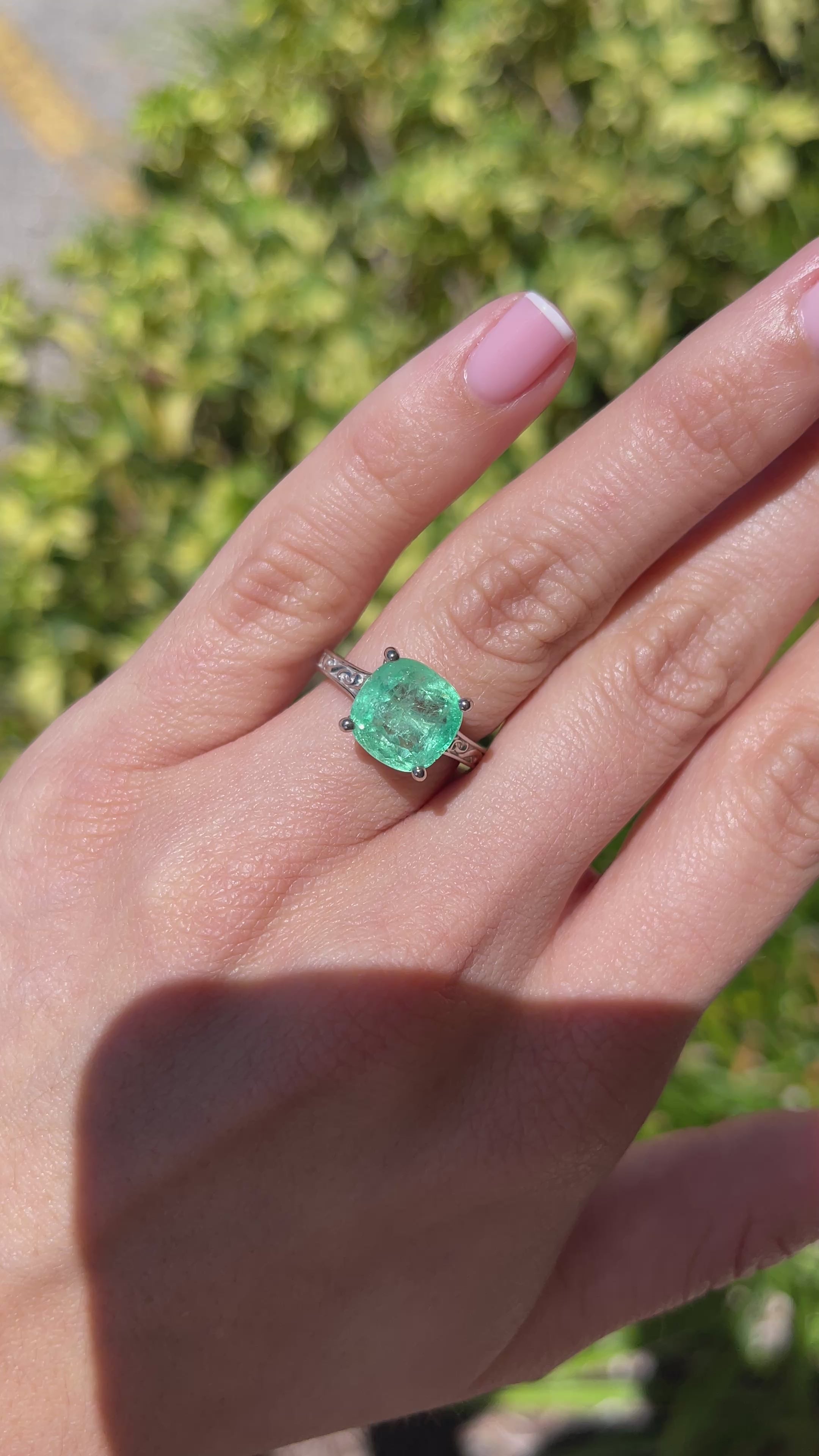 5.34ct Natural Colombian Emerald Seafoam Green Cushion Cut Emerald Right Hand Ring