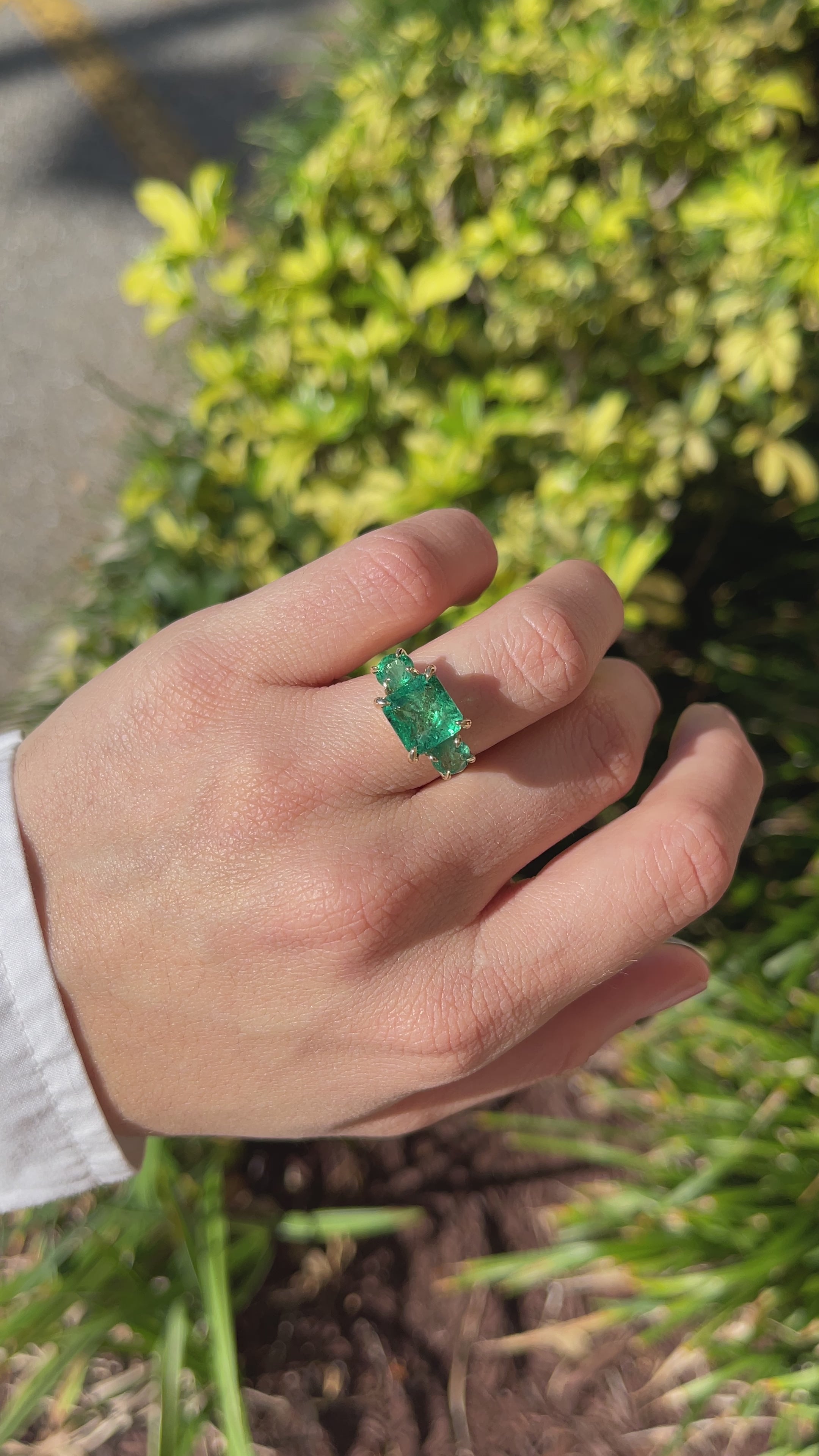 Discover the elegance of this all-emerald three-stone ring, featuring a breathtaking 4.35-carat Asscher-cut natural emerald at its center. This rare gemstone showcases a vivid green hue with mesmerizing depth and clarity. Accentuating the centerpiece are perfectly matched round natural emeralds, enhancing its beauty with harmonious color balance.