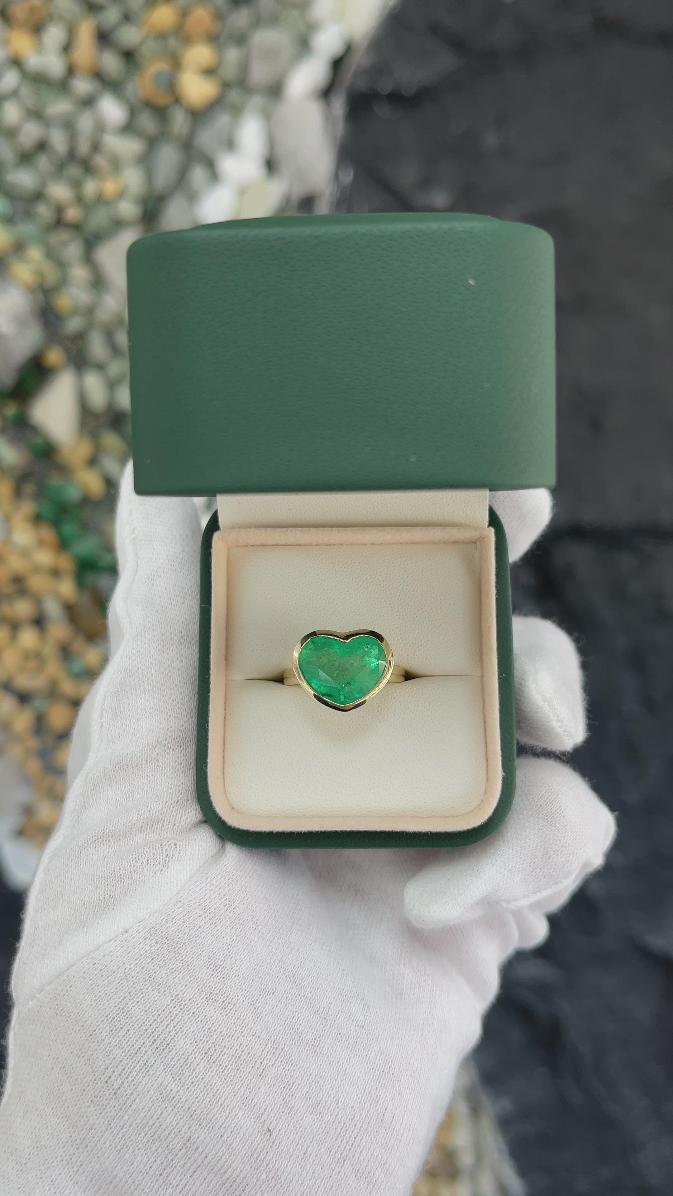 This ring is not for the faint of heart! Displayed is a large Colombian emerald heart solitaire ring in 14K gold. This gorgeous solitaire ring is bezel set in yellow gold and carries a full 6.10-carat emerald that will have you gazing at its mystic beauty. This large gem has minor imperfections as no natural emerald is flawless. This emerald is absolutely stunning and will have you captivated at first glance. This ring is one of a kind and made by our company in South Florida, USA.