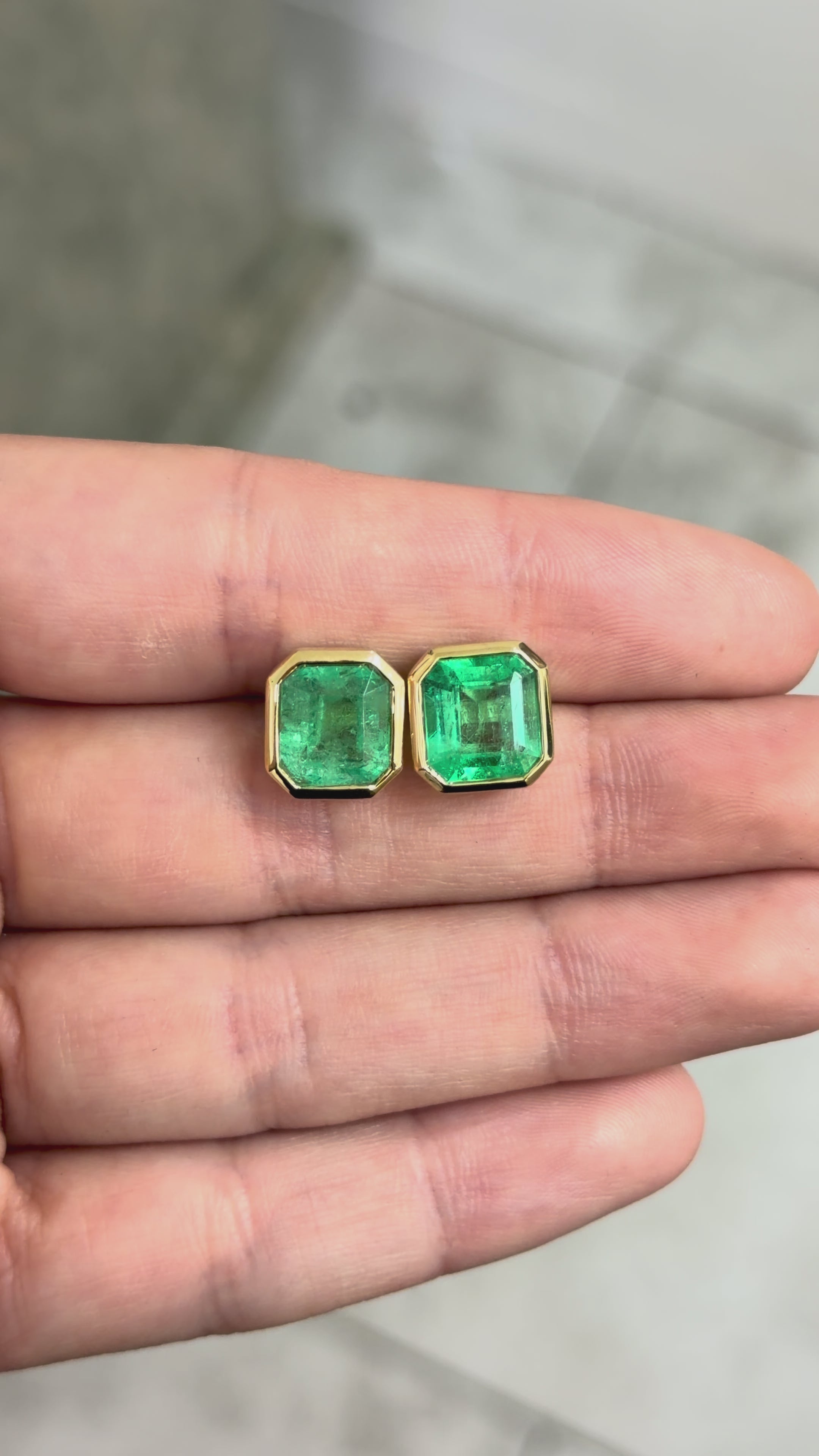 Bezel-set green emerald Asscher cut gemstone stud earrings make a stylish statement in beauty. The earth-mined emeralds are hand-selected and make an incredibly unique pair. As no two emeralds are alike, minor differences are seen in each gem, that will have you dazing into the captivating beauty of a true emerald. These stones have a great spread along with unique clarity that will have you fascinated at first glance. Medium yellowish-rich green color and skillfully hand set in solid secure yellow gold, these emeralds are traced from the Muzo mines. The earrings are available with gorgeous 18K push-back clasps.