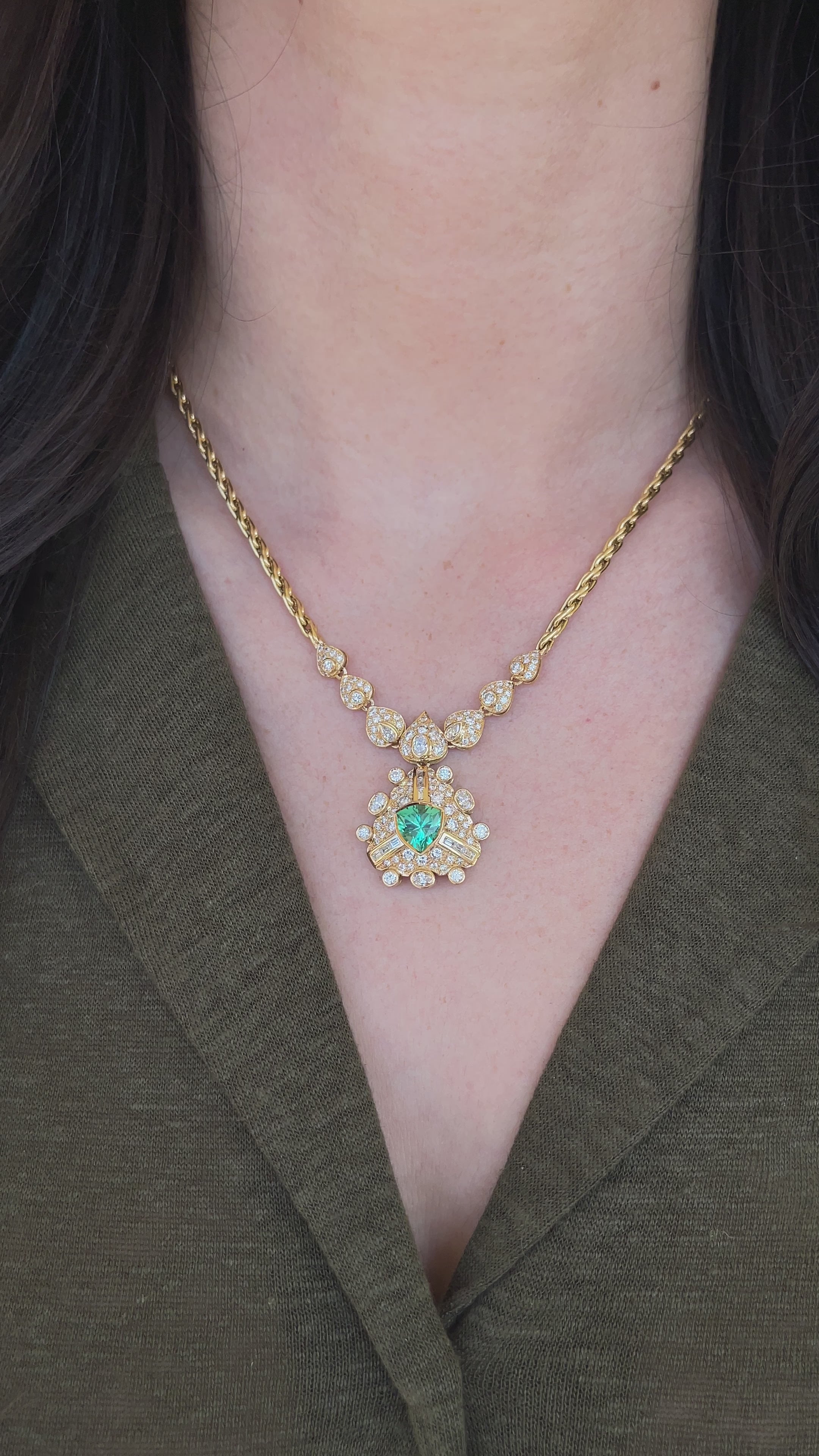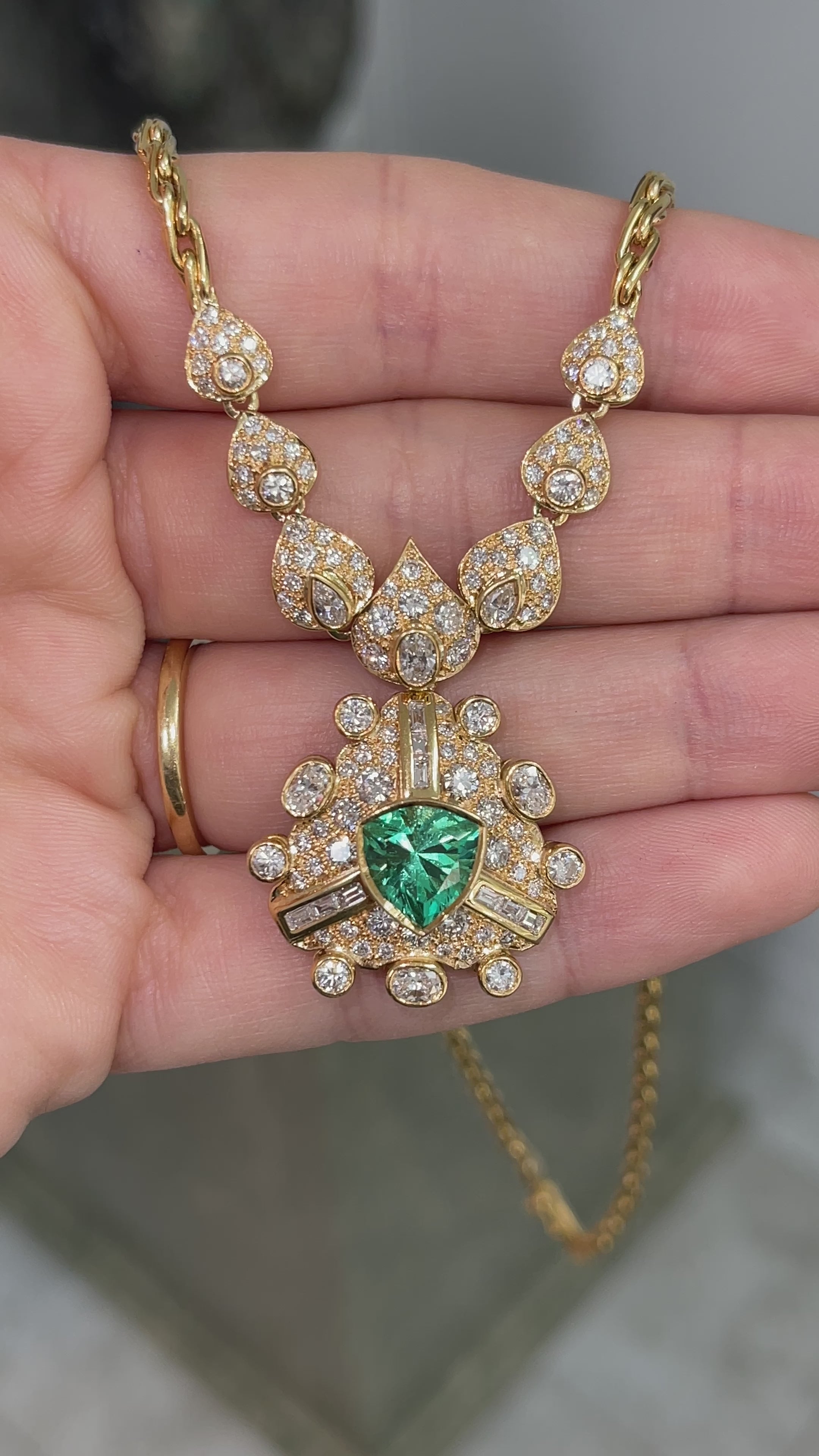 6.28tcw 18K Trillion-Cut AAA+ Vintage 1980s Colombian Emerald & Diamond Necklace Trillion-Cut AAA Natural Emerald