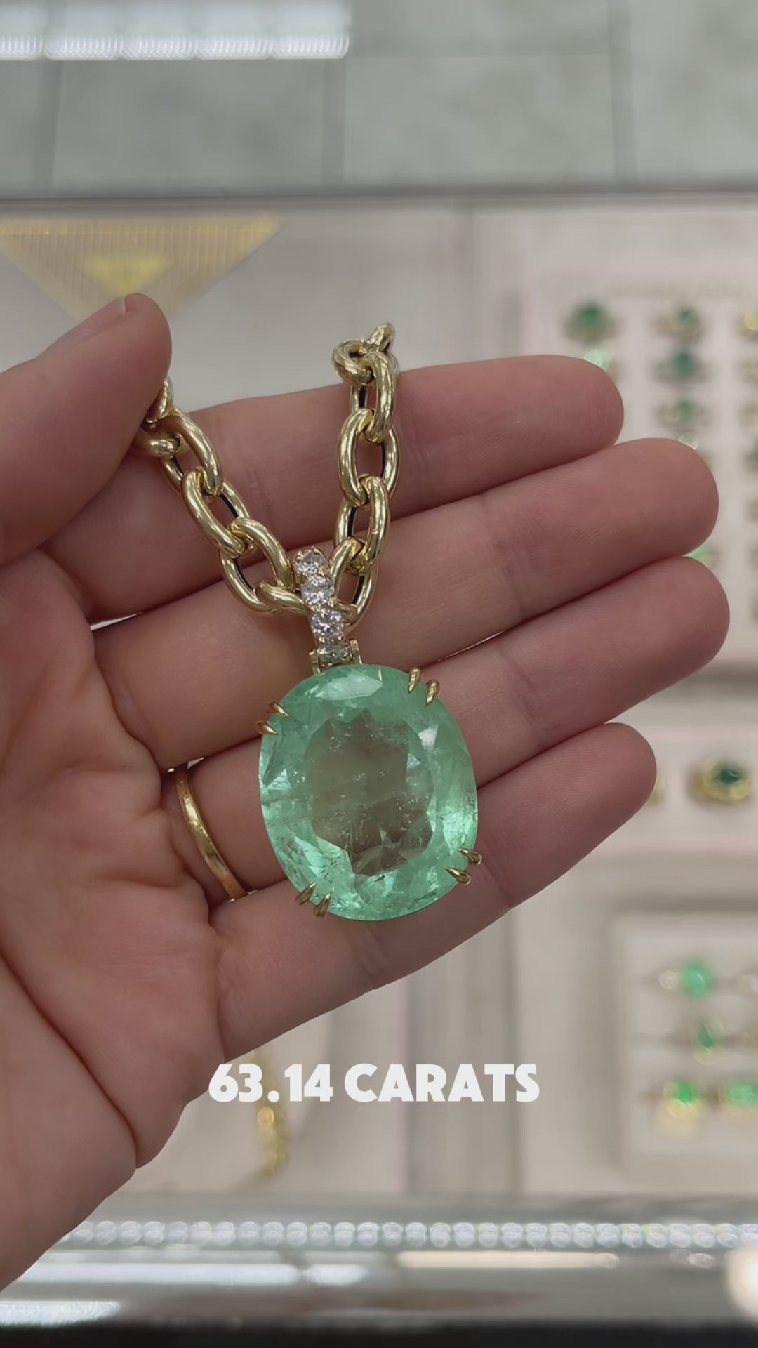 63.14 Carat Light Green Real, Natural Oval Colombian Emerald & Diamond 18K Pendant
