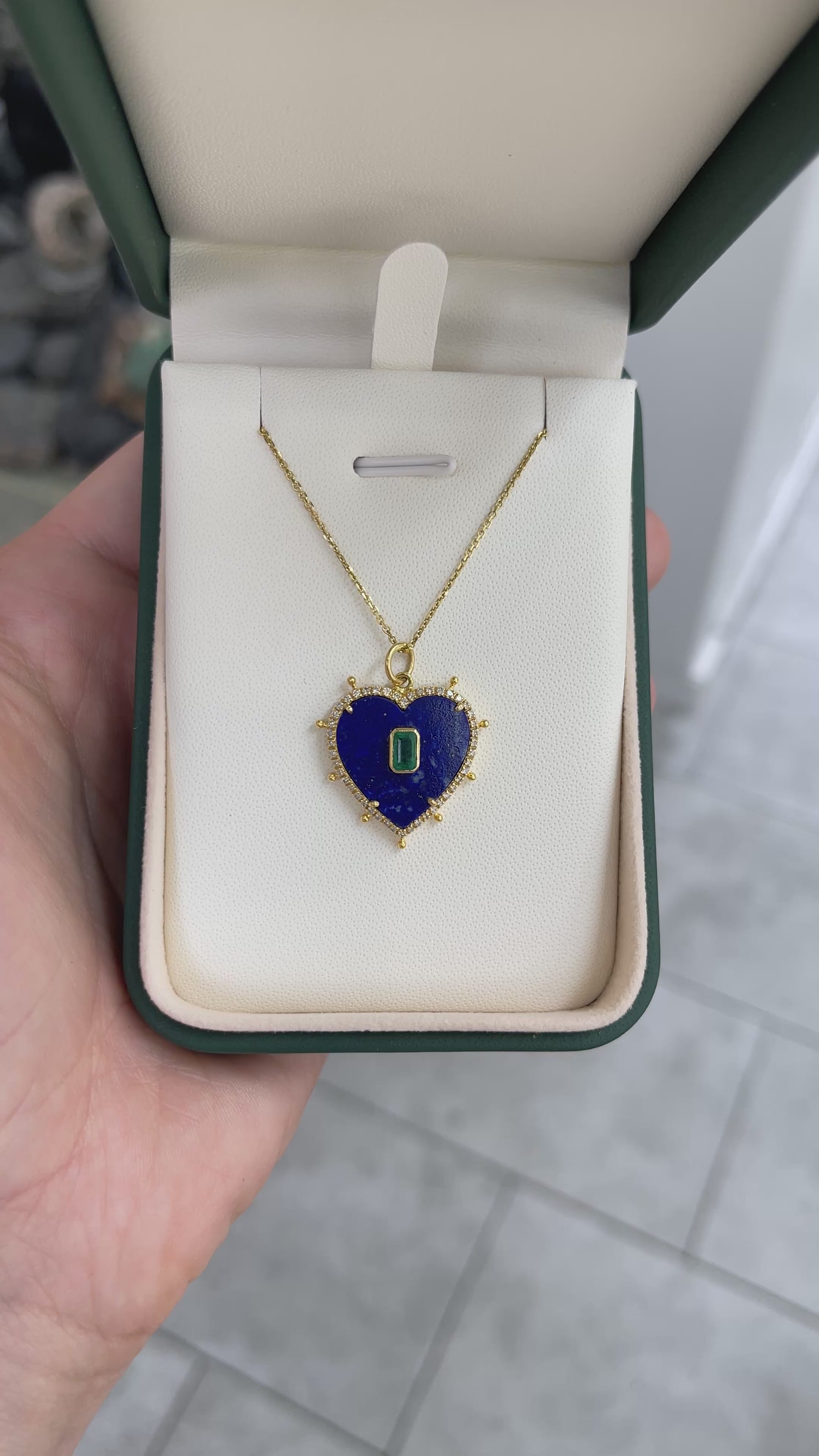 7.11tcw Natural Lapiz, Emerald & Diamond Heart Pendant 14K