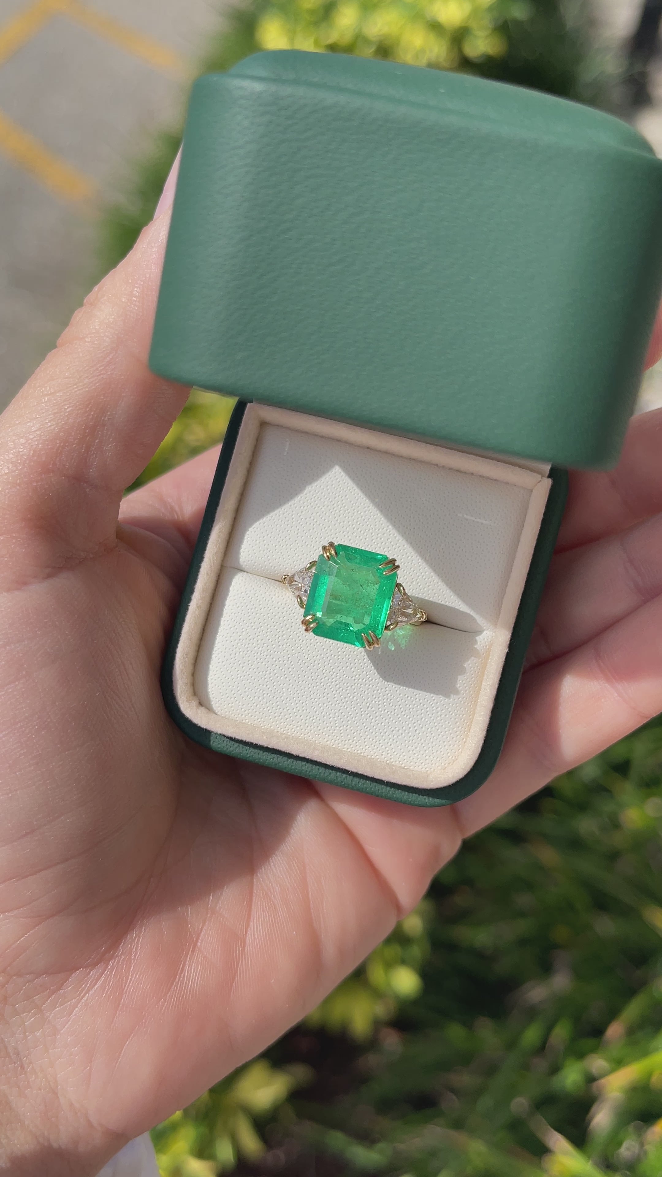7.15tcw Muzo Colombian Emerald & Natural Trillion Diamond Three Stone 18K