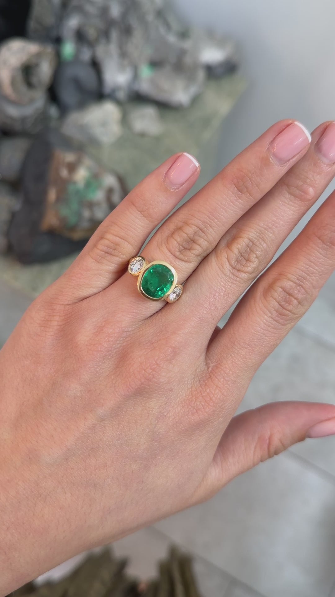 This story begins with a majestic 6-carat cushion-cut Colombian emerald once confined within an outdated ring setting that failed to honor her commanding beauty. When her extraordinary presence was recognized by Matthew Zapata, master jeweler Rob delicately released the gem, initiating a transformation worthy of her rare stature. Countless diamond shapes were auditioned in pursuit of perfect harmony and it became unmistakably evident that only brilliant round diamonds could flank her with a radiant chorus, declaring this creation a true trophy ring. Once the side stones were selected, the vision advanced into meticulous CAD refinement, sculpting every millimeter of the bezel to achieve flawless proportions and full finger coverage that exudes power and sophistication. For a treasure of this magnitude, setting her in 18K yellow gold was not a choice but a destiny, a royal metal that bathes her intense, dark, vivid green in luminous warmth. When the final stones were set by hand, the ring awakened with breathtaking fire, transforming into an iconic three-stone masterpiece that commands reverence and captures hearts the instant she enters the light.