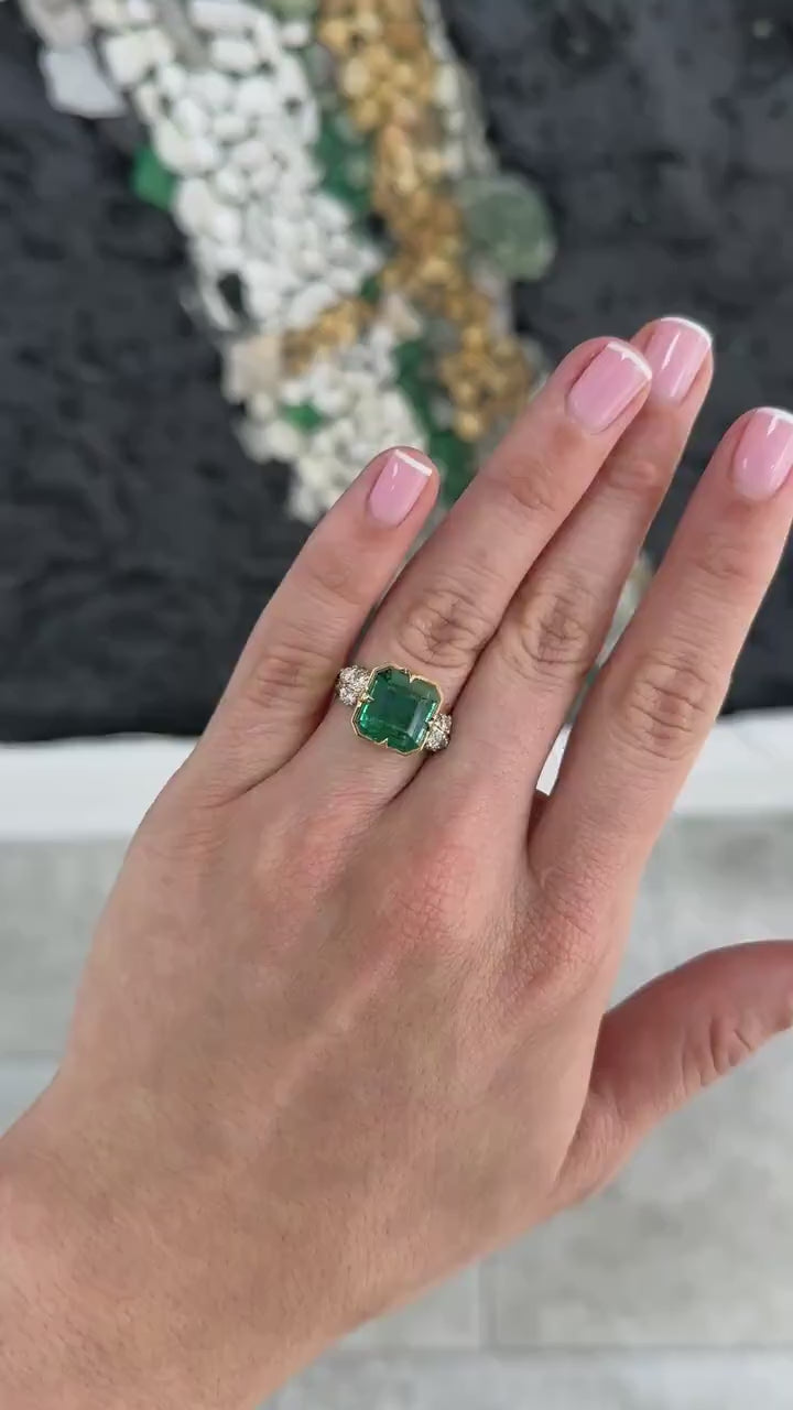 This showstopping ring features a striking asscher-cut natural emerald set in rich yellow gold, flanked by clusters of brilliant round diamonds that radiate elegance and light. With its bold proportions and sharp, clean lines, this piece effortlessly blends vintage glamour with modern edge. Whether chosen as an extraordinary engagement ring or a signature heirloom piece, it's designed to captivate.