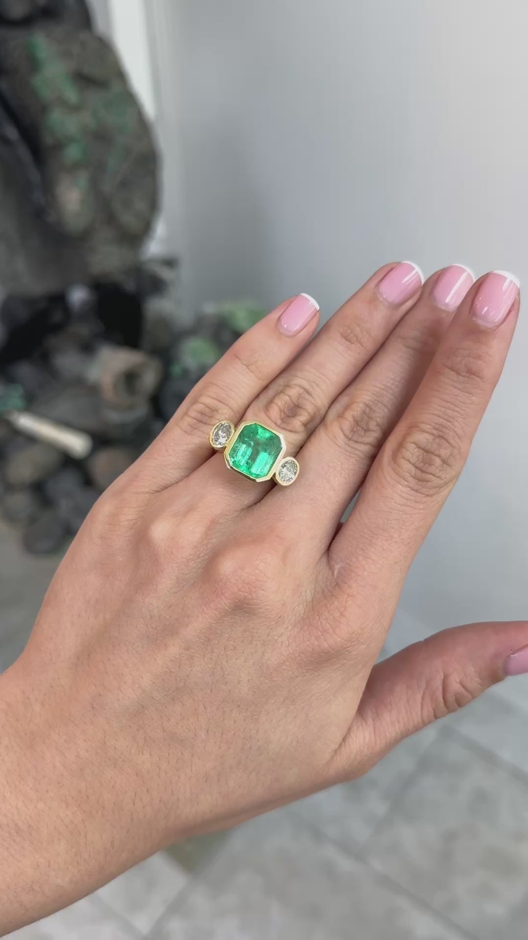 Behold the elegance of our Emerald and Diamond Three Stone Ring, featuring a stunning emerald-cut emerald set north to south in a refined bezel setting. The emerald boasts a spring green hue, with glowing saturation and tone, revealing a transparent clarity that captivates the eye. Accentuating the sides are large oval cut diamonds, their sparkle catching the light at every glance, all meticulously crafted and set in the warmth of 18k yellow gold for a timeless and sophisticated allure.