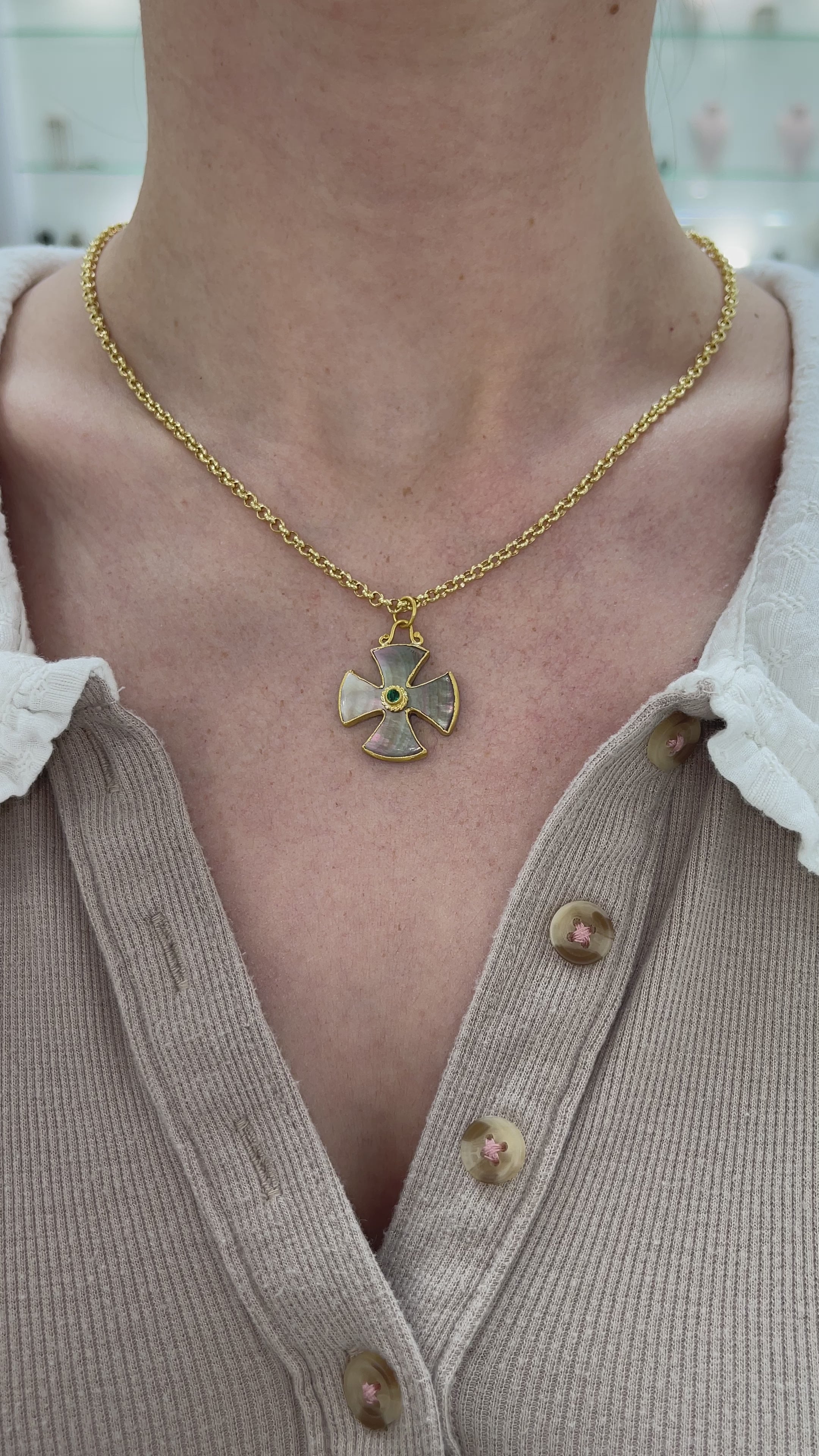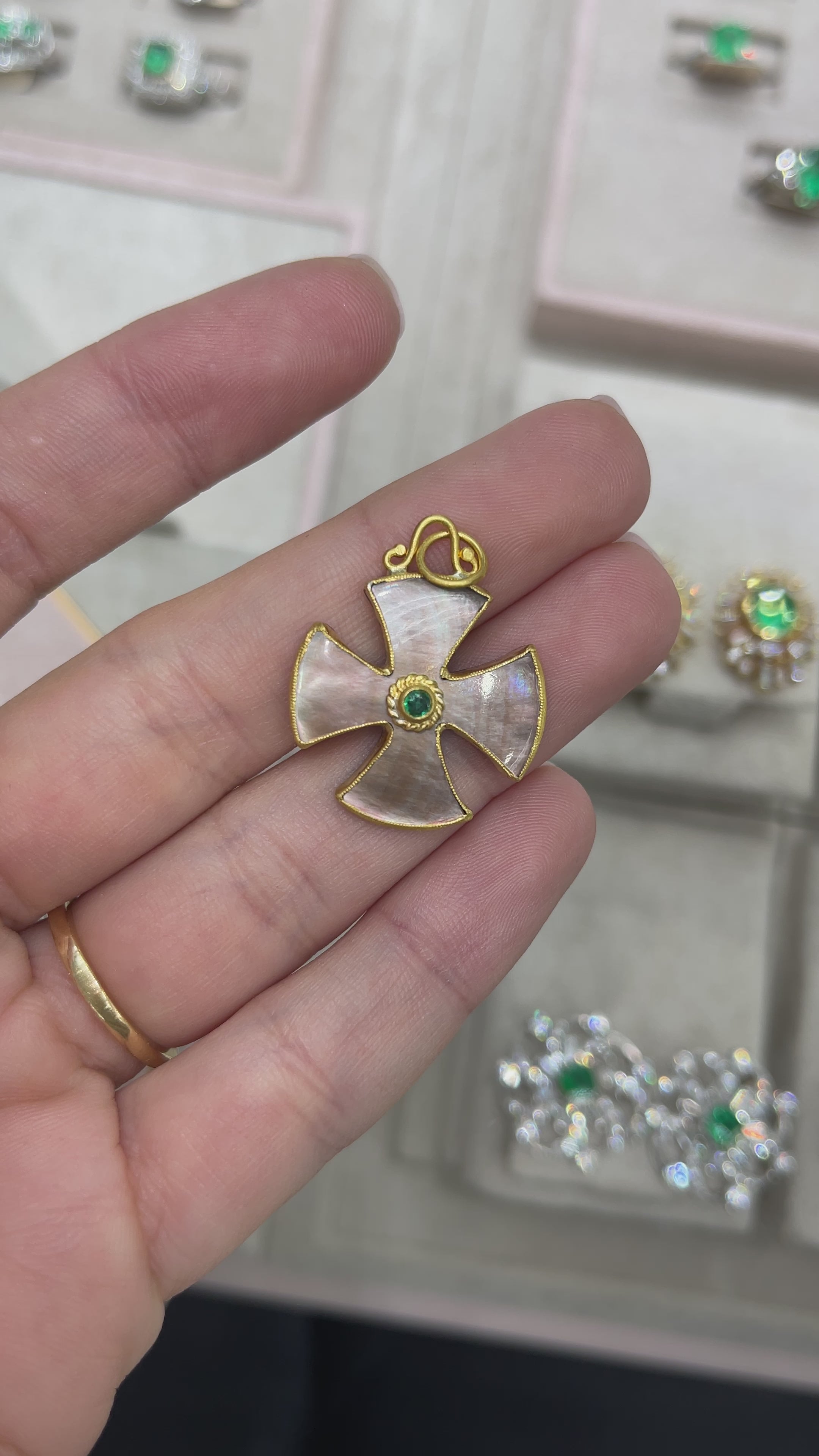 Byzantine 24K Gold & Mother of Pearl Maltese Emerald Cross