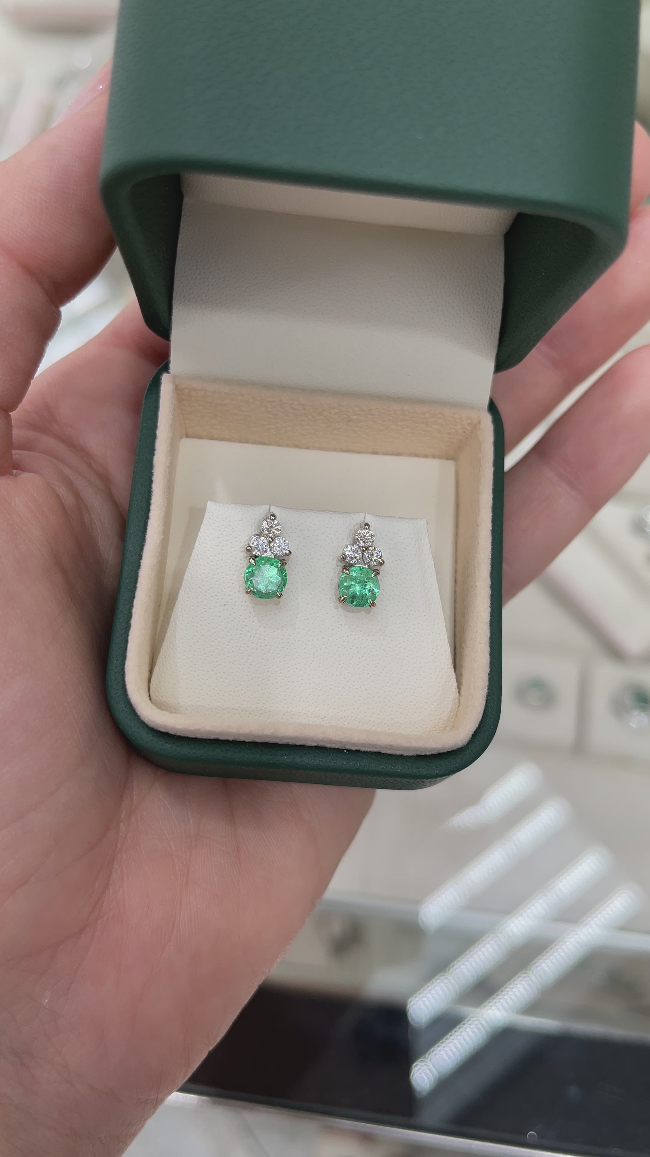 Colombian Emerald & Diamond Trio Stud Earrings in 14K White Gold Natural Green Gemstone Jewelry