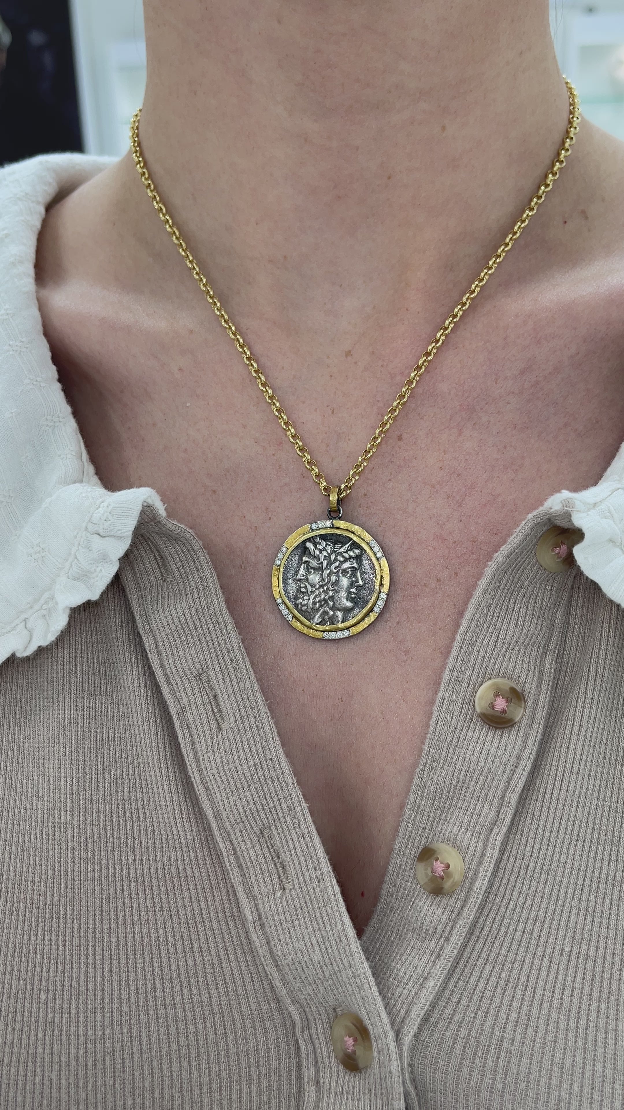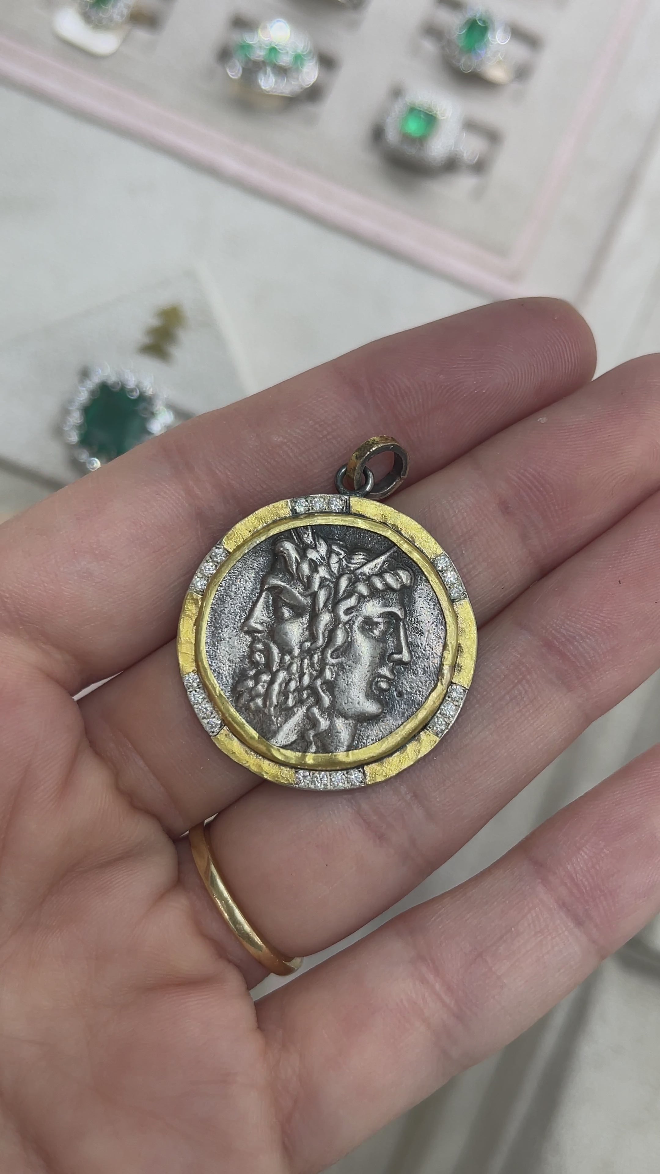 A symbol of transitions, duality, and wisdom, this striking Janus medallion embodies the power of looking to both the past and future. The ancient-inspired coin is encased in a rich 24K gold bezel, adorned with shimmering diamonds that enhance its celestial presence.
