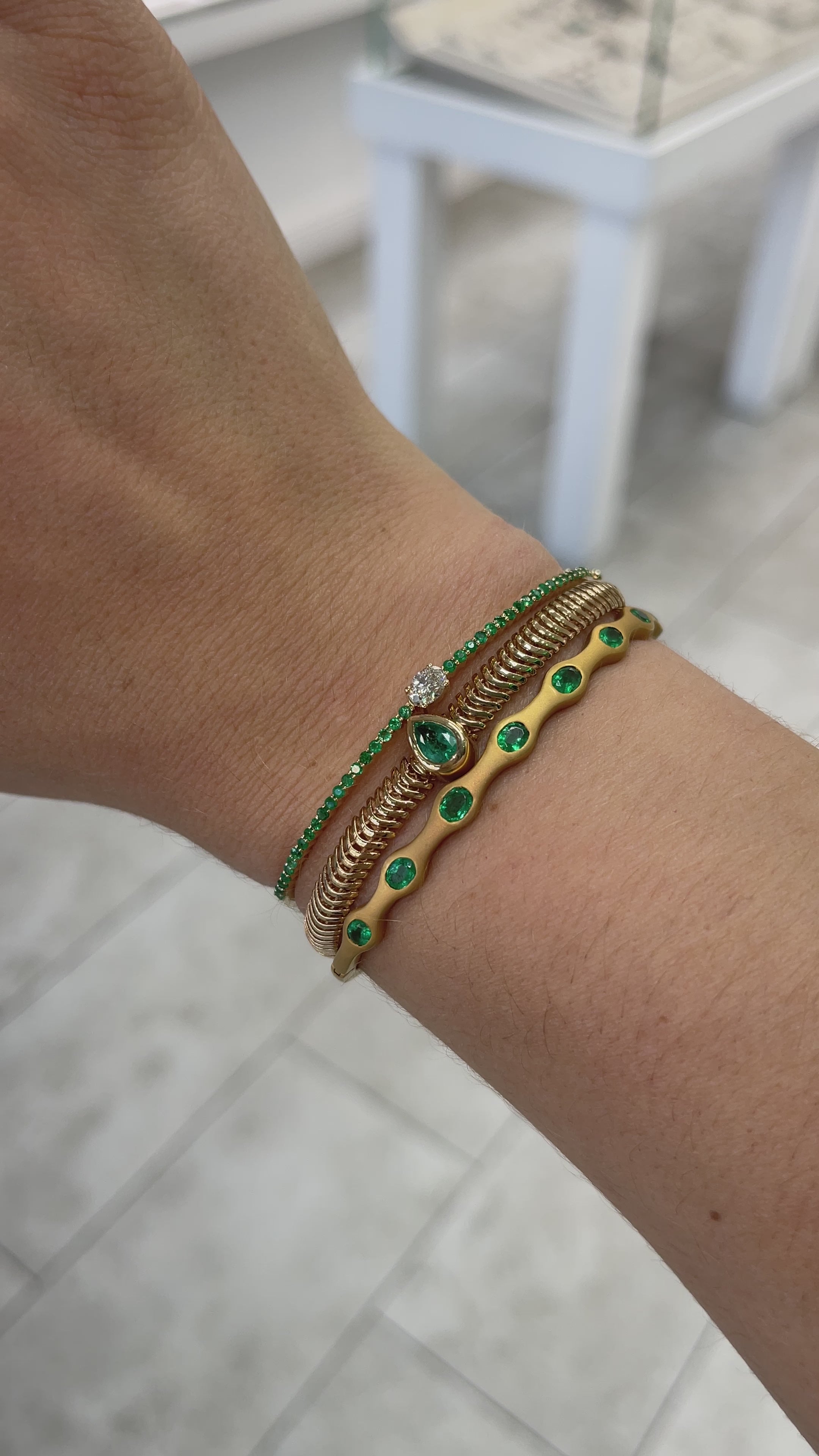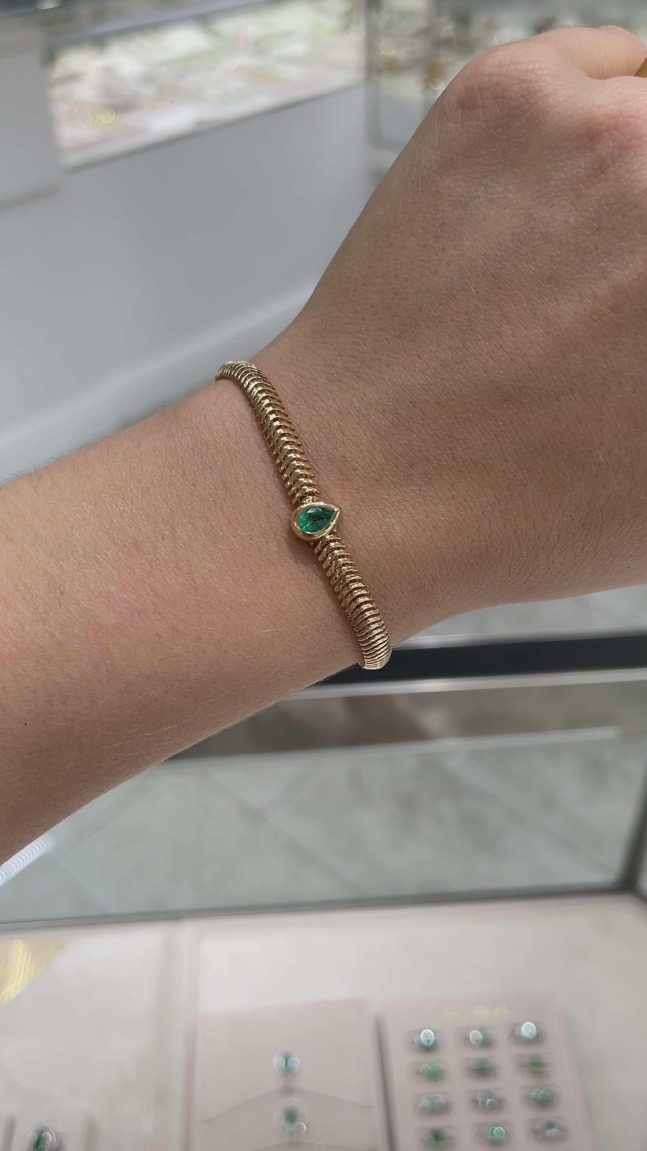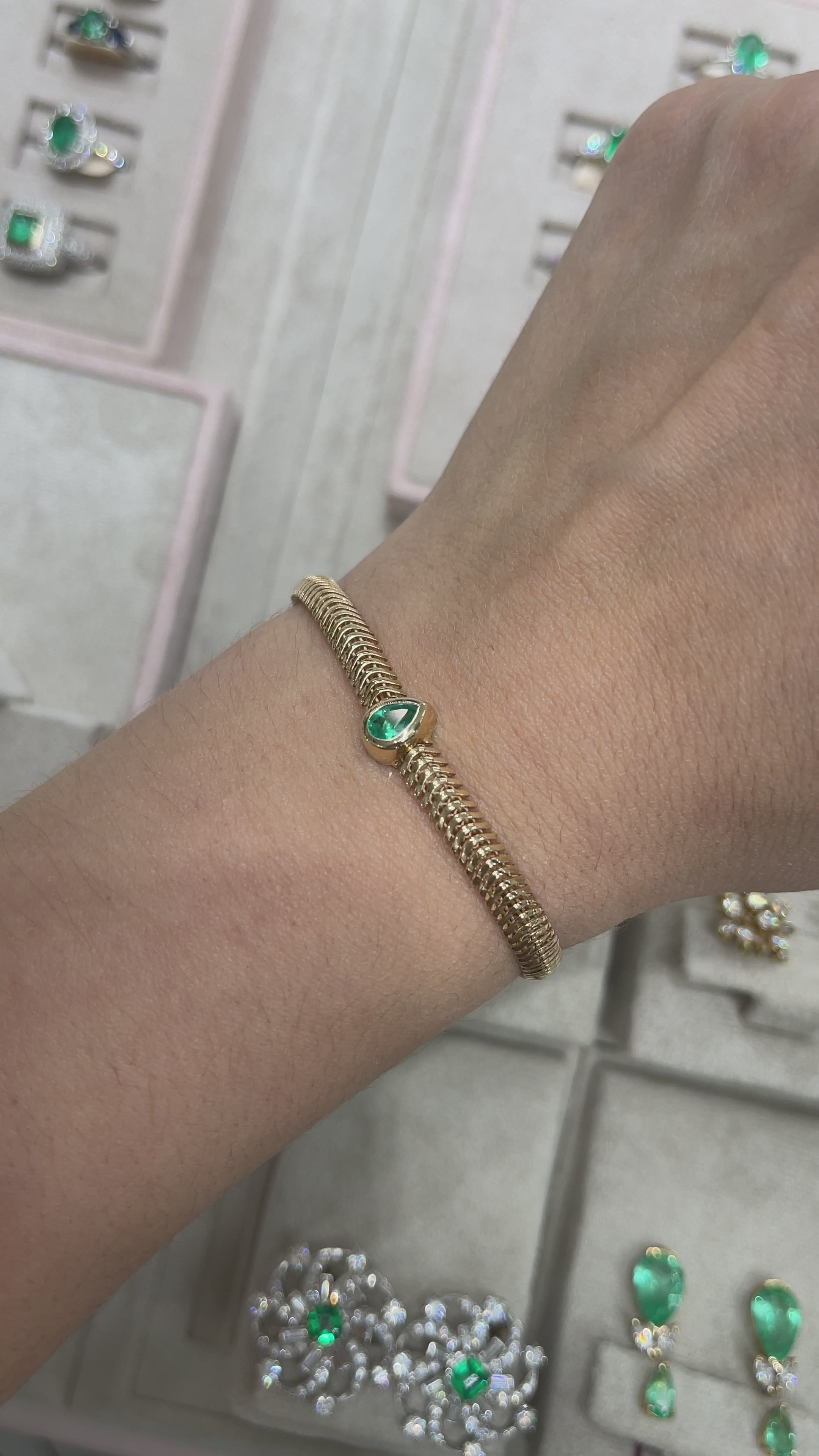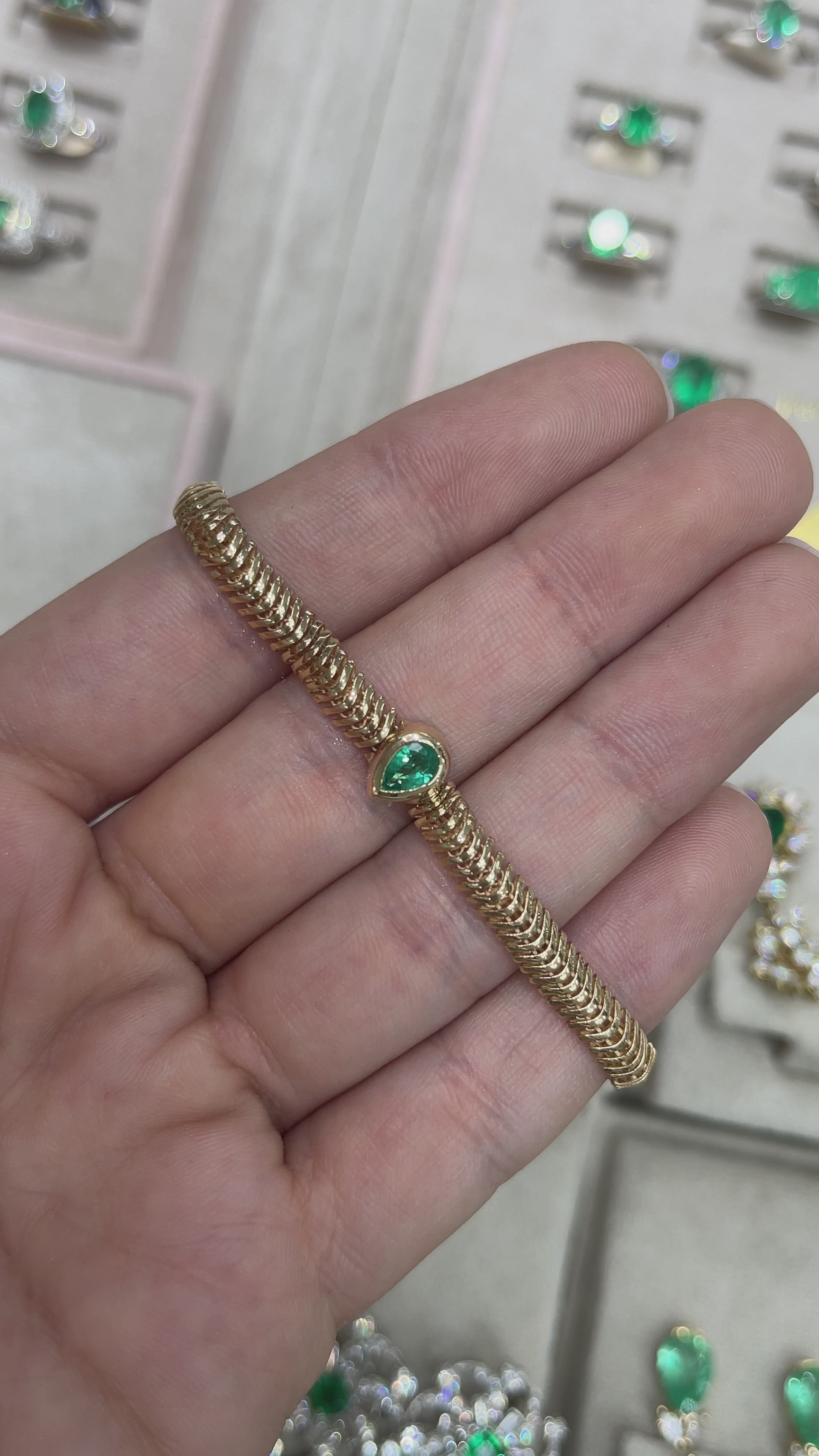 This exquisite emerald and diamond bracelet is a masterpiece of elegance and sophistication. At its heart, a natural teardrop emerald is bezel-set, displaying remarkable size, rich color, and exceptional clarity. The snake chain golden links flow seamlessly, weaving together in a fluid design. Creating a graceful movement with every gesture. Adding a touch of brilliance, the clasp is adorned with pavé-set diamonds, completing the design with a refined sparkle. Measuring 6.5 inches in length, this bracelet is a striking blend of bold beauty and timeless charm.