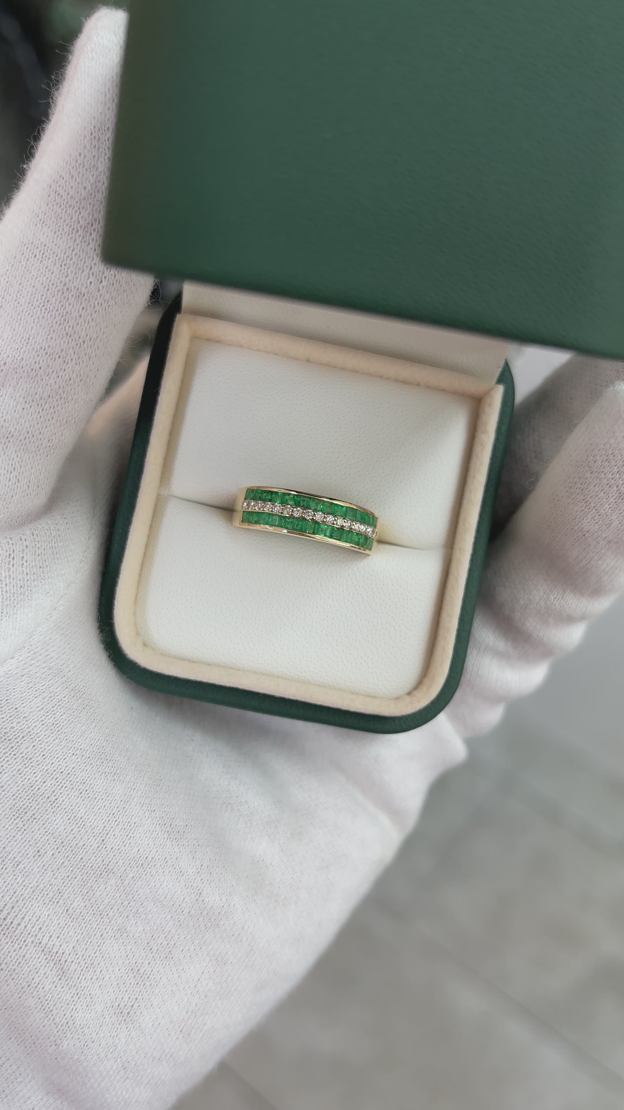 Three Row Square Emerald & Diamond Wedding Band 6mm 14K Gold